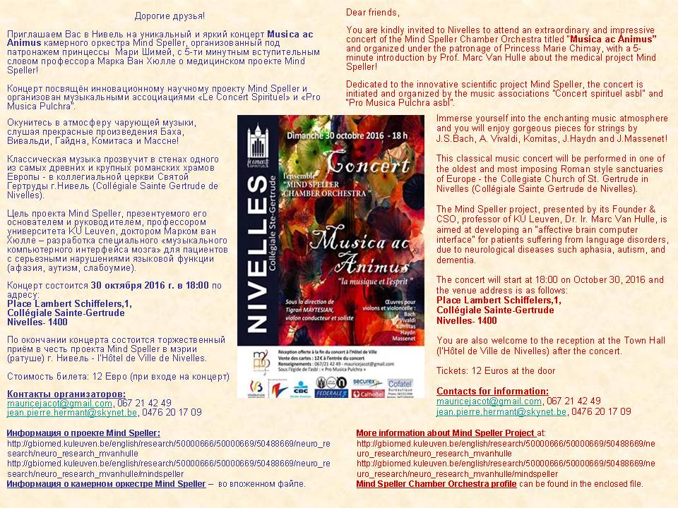 par l'ensemble Mind Speller Chamber Orchestra Дорогие друзья! Приглашаем Вас в Нивель на уникальный и яркий концерт Musica ас Animus камерного оркестра Mind Speller, организованный под патронажем принцессы Мари Шимей, с 5-ти минутным вступительным словом профессора Марка Ван Кюлле о медицинском проекте Mind Speller! Концерт посвящён инновационному научному проекту Mind. Speller и организован музыкальными ассоциациями « Lе Concert Spirltuel » и « Рго Musica Pulchra ». Окунитесь в атмосферу чарующей музыки, слушая прекрасные произведения Баха, Вивальди, Гайдна, Комитаса и Массне! Классическая музыка прозвучит е стенах одного из самых древних и крупных романских храмов Европы - в коллегиальной церкви Святой Гертруды г. Нивель (Collegiate Salnte-Gertrude dе Nivelles). Цель проекта Mind Speller, презентуемого его основателем и руководителем, профессором университета KU Leuven, доктором Марком ван Кюлле — разработка специального « музыкального компьютерного интерфеиса мозга« для пациентов с серьёзными нарушениями языковой функции (афазия, аутизм, слабоумие). По окончании концерта состоится торжественный приём в честь проекта Mind Speller в мэрии (ратуше) г. Нивель - Hôtel dе Ville dе Nivelles.