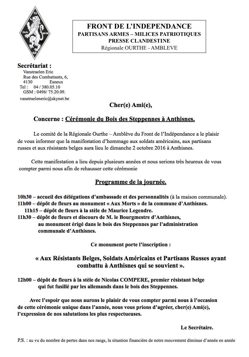 Front de l'Indépendance Partisans Armés — Milices Patriotiques Presse Clandestine Régionale Ourthe - Amblève. Cher(e) Ami(e), Le comité de la Régionale Ourthe — Amblève du Front de l'Indépendance a le plaisir de vous informer que la manifestation d'hommage aux soldats américains, aux partisans russes et aux résistants belges aura lieu le dimanche 2 octobre 2016 à Anthisnes. Cette manifestation a lieu depuis plusieurs années et nous serions très heureux de vous compter parmi nous afin de rehausser cette cérémonie Programme de la journée. 10h30 — accueil des délégations d'ambassade et des personnalités (à la maison communale). 11h00 — dépôt de fleurs au monument « Aux Morts » de la commune d'Anthisnes. 11h15 — dépôt de fleurs à la stèle de Maurice Legendre. 11h30 — dépôt de fleurs et discours de M. le Bourgmestre d'Anthisnes, au monument érigé dans le bois des Steppennes par l'administration communale d'Anthisnes. Ce monument porte l'inscription : « Aux Résistants Belges, Soldats Américains et Partisans Russes ayant combattu à Anthisnes qui se souvient ». 12h00 — dépôt de fleurs à la stèle de Nicolas COMPERE, premier résistant belge qui fut fusillé par les allemands dans le bois des Steppennes. Avec l'espoir que nous aurons le plaisir de vous compter parmi nous à l'occasion de cette cérémonie unique dans l'année, nous vous prions d'agréer, cher(e) Ami(e), l'expression de nos salutations les plus respectueuses. Le Secrétaire.