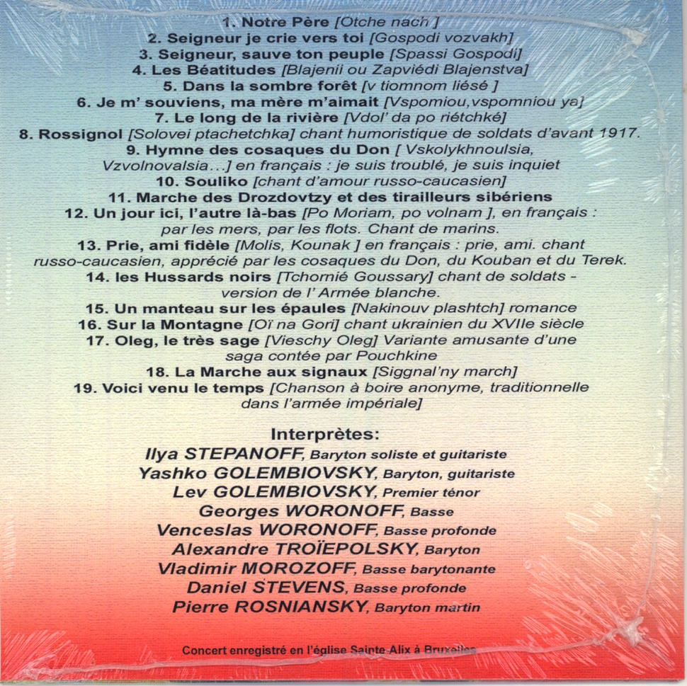 Certains le savent déjà, nous avons formé un chœur russe d'hommes dans lequel Georges Woronoff, son fils Wenceslas, Sacha Troïepolsky, Yashko et Liona Golembiovski, Ilya Stepanow, Vladimir Morozoff et moi-même nous chantons sous la direction de Pierre Rosniansky.