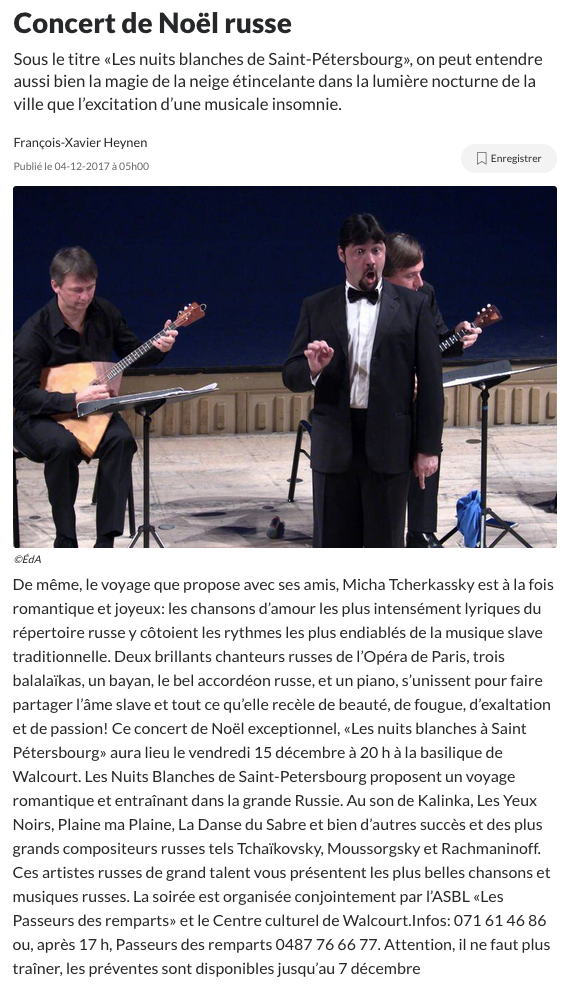 De même, le voyage que propose avec ses amis, Micha Tcherkassky est à la fois romantique et joyeux: les chansons d’amour les plus intensément lyriques du répertoire russe y côtoient les rythmes les plus endiablés de la musique slave traditionnelle. Deux brillants chanteurs russes de l’Opéra de Paris, trois balalaïkas, un bayan, le bel accordéon russe, et un piano, s’unissent pour faire partager l’âme slave et tout ce qu’elle recèle de beauté, de fougue, d’exaltation et de passion! Ce concert de Noël exceptionnel, «Les nuits blanches à Saint Pétersbourg» aura lieu le vendredi 15 décembre à 20 h à la basilique de Walcourt. Les Nuits Blanches de Saint-Petersbourg proposent un voyage romantique et entraînant dans la grande Russie. Au son de Kalinka, Les Yeux Noirs, Plaine ma Plaine, La Danse du Sabre et bien d’autres succès et des plus grands compositeurs russes tels Tchaïkovsky, Moussorgsky et Rachmaninoff. Ces artistes russes de grand talent vous présentent les plus belles chansons et musiques russes.