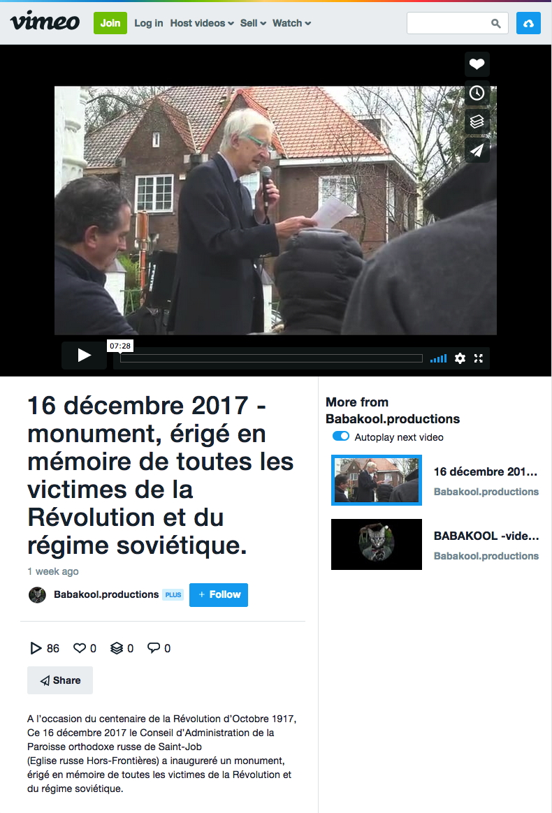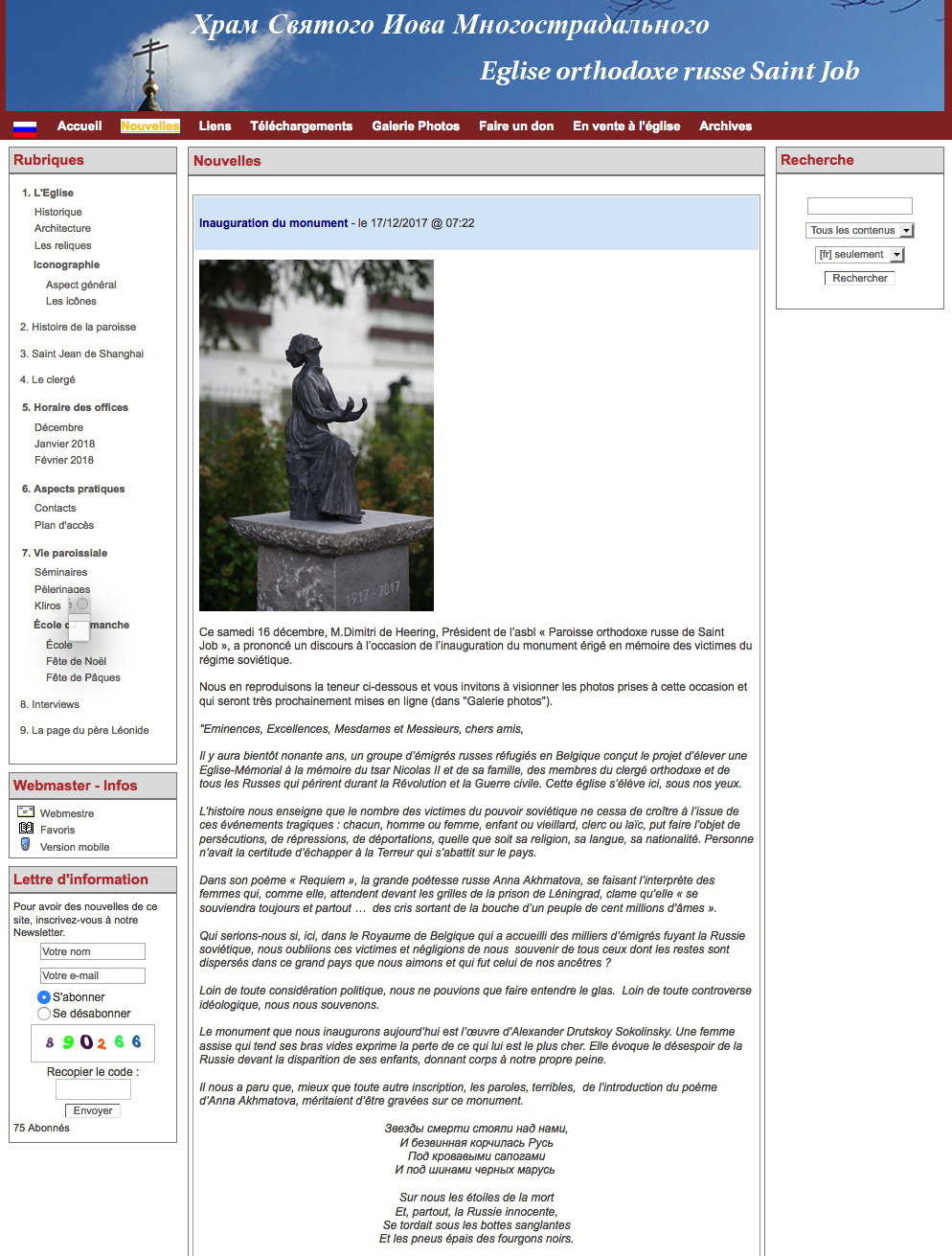 Monument exécuté par l'artiste Alexander Drutskoy Sokolinsky A l'occasion du centenaire de la révolution d'octobre 1917, le Conseil d'Administration de la Paroisse orthodoxe russe de Saint-Job (Eglise russe Hors-Frontières) inaugurera un monument érigé en mémoire de toutes les victimes de la révolution et du régime soviétique. Le Conseil d'Administration désire donner à cette cérémonie un caractère strictement séculier, les victimes dont on garde la mémoire appartenant à toutes les nationalités et à toutes les confessions.