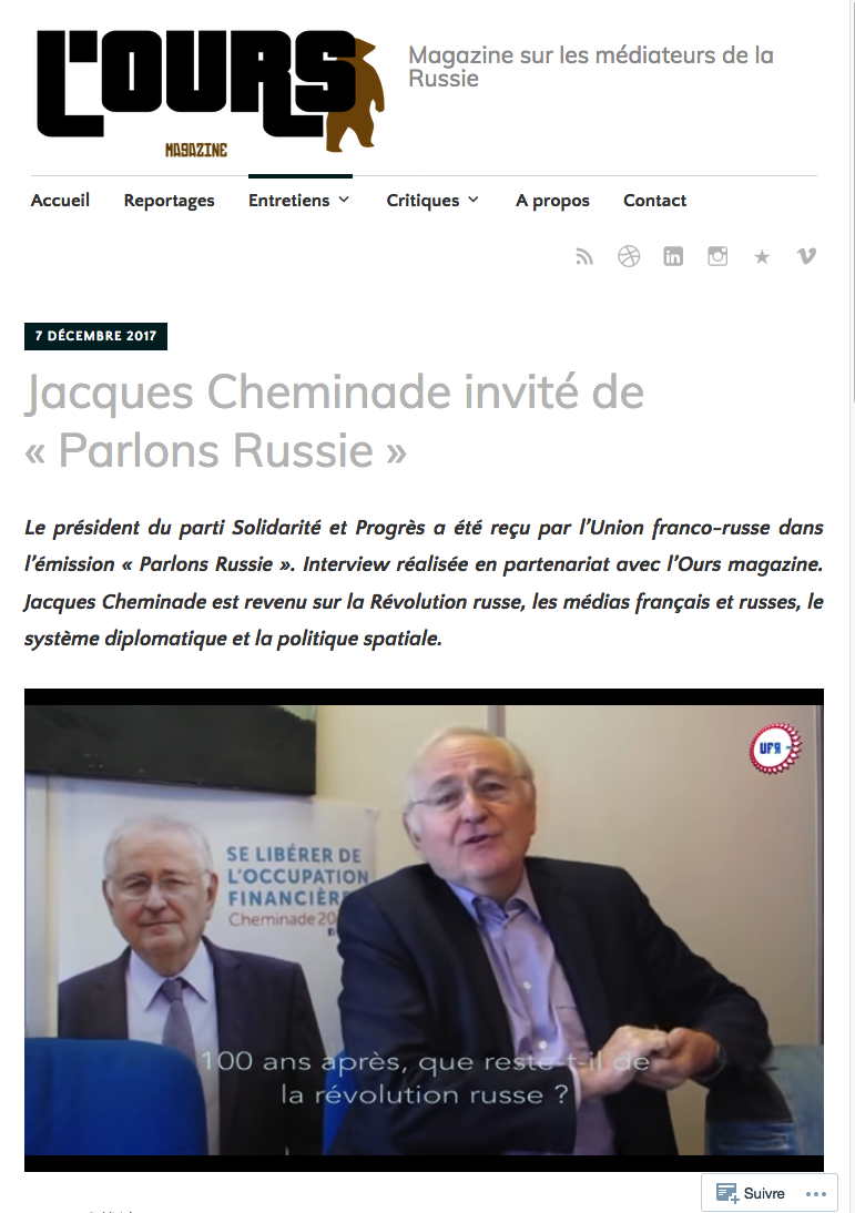 L'Ours. Magazine sur les médiateurs de la Russie. Interview par Paul Leboulanger. Le président du parti Solidarité et Progrès a été reçu par l’Union franco-russe dans l’émission « Parlons Russie ». Interview réalisée en partenariat avec l’Ours magazine. Jacques Cheminade est revenu sur la Révolution russe, les médias français et russes, le système diplomatique et la politique spatiale.
