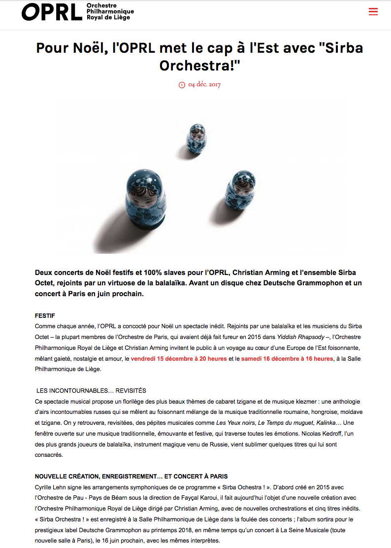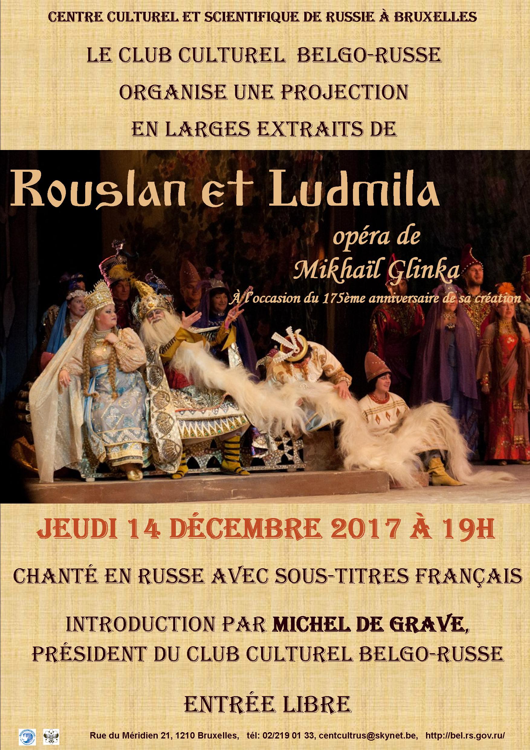 par Michel De Grave Club culturel belgo-russe, asbl | Belgische Russische Cultureel Club, vzw | Русско-Бельгийский културный Клуб - Rousslan et Loudmila, opéra de Glinka, Chanté en russe, sous-titré en français (en extraits) => Jeudi 14 décembre 2017 à 19h au CCSBR ; - Vladimir Poutine inaugure un mémorial aux victimes des répressions politiques ; - L’hebdomadaire La Russie, publié à Bruxelles en 1900, témoigne des échanges commerciaux et de la présence russe en Belgique dès cette époque ; - Qui est Razoumovsky, dédicataire des Quatuors Razoumovsky de Beethoven qu’on rejoue le 17 décembre? => Dimanche 17 décembre 2017 à 11h11 ; - Conférence de Michel De Grave « Les Compositeurs russes après 1917. Rester ou partir? Et quoi après? » => Lundi 5 février 2018 ; - Exposition Dostoïevski à Bougival =>10-25 mars 2018 ; - Le dernier concert à Bruxelles de Pierre Rosniansky, il y a trois ans, le 24 novembre 2014 ; - La Musique russe, tableau de James Ensor (1881) ; - Filiation de deux tableaux : Signorini et Répine ; - À la Veille (1860), troisième roman de Tourguénniev ; - Soirée à Liège avec Kalinka.