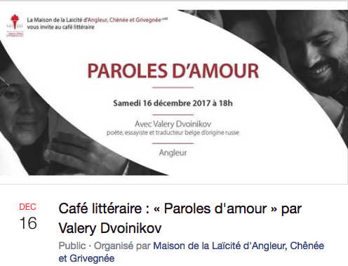 Événements de décembre 2017 : 1 => Coopération internationale intra-villes (Liège) 1 => Музыкальный онлайн конкурс Хит-Парад ТОП-15 - 2017 (Hamburg) 2 => Artmarkt (Antwerpen) 2 => Oeral Kozakkenkoor (Massemen) 2 => Liens économiques & politiques entre Russie et Europe (Saint-Josse) 2 => Автобусная экскурсия. Новогодние ярмарки в Германии : Моншау, Ахен. 2 => Вечер поэзии и джаза (Sossenheim) 2-3 => Встреча с Андреем Грицманом (Saint-Josse) 3 => La Lyre émigrée : Soirées automnales (Saint-Josse) 3 => Question migratoire européenne (Saint-Josse) 3 => Exposition Yolanda & H. — Boris Mestchersky (Bruxelles) 3 => Мир фантазий (Bruxelles) 4 => Séminaire : sources et sens conservatisme russe (Paris) 4, 18 => Table de conversation (Mons) 4 => Rôle passé historique entre Russie et Belgique (Liège) 5 => Rôle histoire entre Russie et Pays-Bas (Liège) 5-6 => Vente et livres russes (Paris) 6 => Египет – сын тысячелетий (Bruxelles) 7 => Океания. Путешествии по необъятному (Bruxelles) 8 => Journée d'études : 1917 à Paris (Paris) 8 => Russian multi-artistic festival (Bruxelles) 9 => Искусство и революция (Bruxelles) 10 => Concert de Noël (Floriffoux) 10, 17 => Античность. С чего начиналась классика | Когда боги ходили по земле (Bruxelles) 11 => Atlas historique de la Russie : d'Ivan III à Vladimir Poutine (Paris) 11 => Conference on rating industry in Russia (Antwerpen) 14 => Rouslan et Ludmila de Glinka (Saint-Josse) 15 => Ambassador's cocktail (Louvain-la-Neuve) 16-17 => Автобусная экскурсия. Баден-Баден, Страсбург Рождественскии ярмарки 16 => Египет – колыбель цивилизации (Bruxelles) 16 => Львёнок и черепаха. Le lionceau et lla tortue (Liège) 17 => Ballet : The Nutcracker (Kinepolis) 17 => Muzyczna chwila z Fryderykiem Szopenem (Chênée) 23 => Oeral Kozakkenkoor & Ensemble Uzory (Sint-Agatha-Berchem) 27-> => Welcome to Eternal Russia (Bruxelles) 29-> => Je veux voir Mioussov (Jambes) 31 => Новогодний вечер (Gentbrugge)