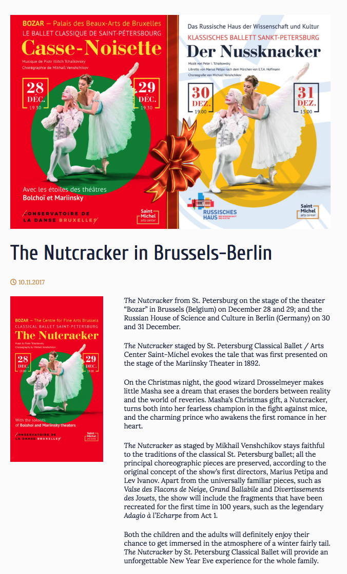 Saint-Michel Arts Center The Nutcracker from St. Petersburg on the stage of the theater “Bozar” in Brussels (Belgium) on December 28 and 29; and the Russian House of Science and Culture in Berlin (Germany) on 30 and 31 December.