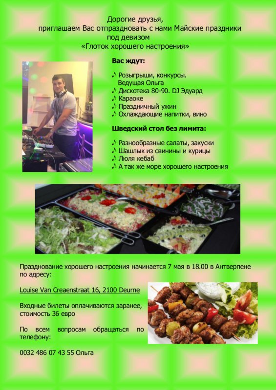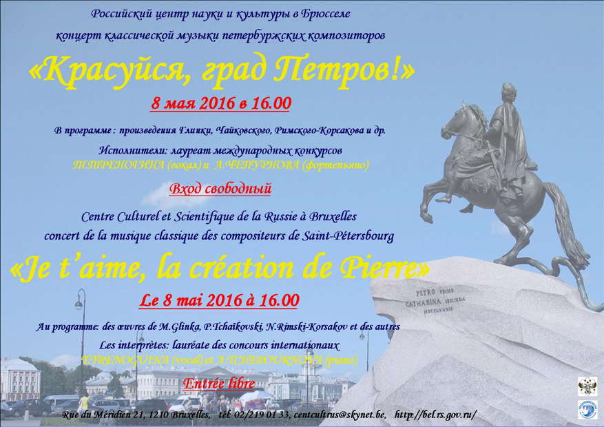 Вход : 35€ ( резервация обязательна) | Cost : 35€ (reservation is obligatory) Вышеуказанную сумму необходимо перечислить на счет ассоциации по реквизитам: « Belarus Today », Belfius Bank IBAN : BE11 0634 2178 6448, указав фамилию, количество гостей и назначение платежа « Concert » За подробной информацией о мероприятии обращаться по э-почте : belarustoday at telenet dot be