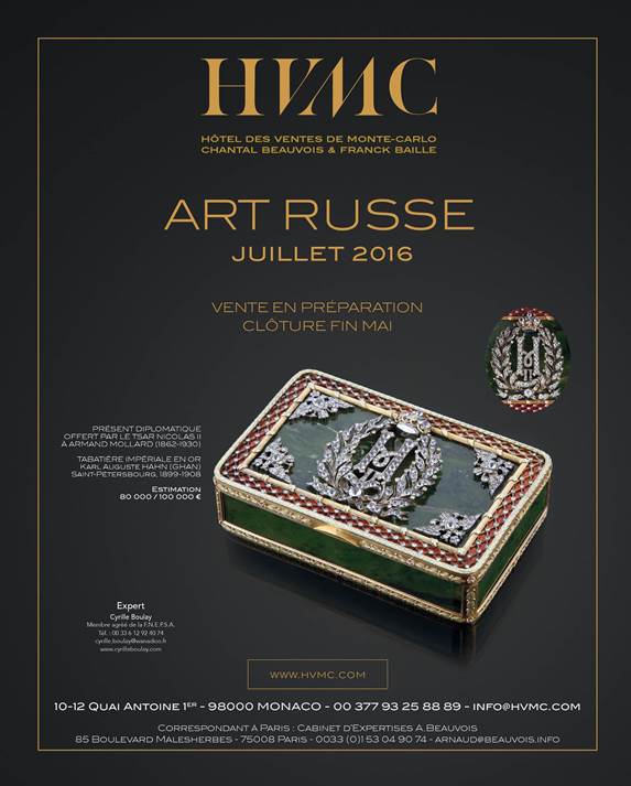 Upcoming Russian Art Sale July 2016 - HVMC Monaco - Deadline for catalogues entries late May 2016 | Prochaine vente d'Art Russe Juillet 2016 - HVMC Monaco - Clôture du catalogue fin Mai 2016 Chers clients, Nous avons l’honneur et le plaisir de vous faire part de cette prochaine vente d’Art Russe actuellement en préparation qui se tiendra à l’Hôtel des Ventes de Monte-Carlo en Juillet 2016. Nous restons à votre entière disposition si vous souhaitez inclure des lots dans cette vacation. Bien cordialement, Cyrille Boulay Expert Art Russe et Souvenirs Historiques Membre de la FNEPSA Tel. : +33 (0) 6 12 92 40 74 E-mail : cyrille.boulay@wanadoo.fr Site : www.cyrilleboulay.com