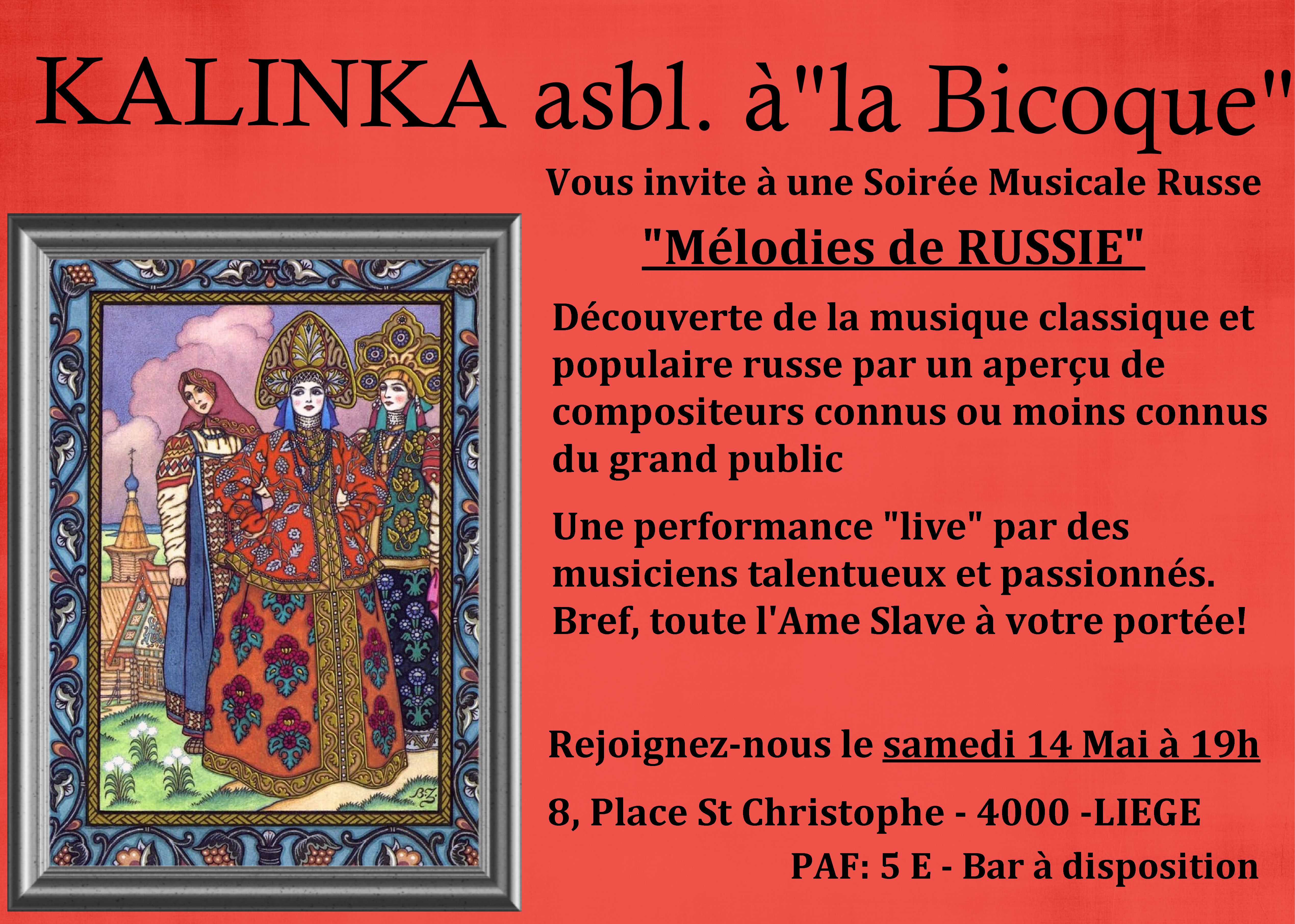 Nos événements en 2016 Centre interculturel Slavianka ART asbl Nouvelle activité : Atelier Théâtre avec Irena Snytko ; 16 janvier à 18h - Fête de Noël Slave, soirée festive des membres de l’association ; 6 février à 18h - Concert « Chansons par Alina Maton », romances, chansons populaires. Sur réservation : PAF 10€ (8€ membres, abonnés) ; 8-12 février - Stage « Matinée en musique », pour les enfants de 5 à 10 ans. Programme du stage ; 13 février à 18h - Soirée poésie. George Yréval, et Yang Ming « La poésie d'amour, entre la Belgique, la Russie et la Chine », intermezzo musical* ; 5 mars –à 18h Soirée VIP, Concert du groupe pop-folk franco-russe « Vesna », Sur réservation : PAF 12.50€ (10€ membres, abonnés) ; 19 mars à 18h- Soirée « À la croisée des cultures : Ukraine », au Centre laïque d'Angleur, place Andréa Jadoulle 14, Angleur, réservations : angleur.laicite at gmail dot com ; 16 avril à 18h- Concert « La Femme, L’Amour et l’Opéra », par Victoria Adams (Oksana Goncharuk). Sur réservation : iPAF 10€ (8€ membres, abonnés) ; 7 mai à 15h - Concours de piano pour le tout petits « Pia-pia-piano » ; 21 mai à 18h – Soirée festive « Vichivanka », broderie ukrainienne* : Vente de chemises brodées ukrainiennes, repas traditionnels ukrainiens, Dress code : porter une broderie ukrainienne, Sur réservation : PAF 30€ (25€ membres, abonnés) ; 4 juin à 18h Soirée VIP - Concert de Nicolas Martin, piano, http://www.nicolas-martin.com/ Sur réservation : PAF 10€ (8€ membres, abonnés) ; 18 juin à 18h - Concert « Nos talents », par l’atelier chant et cours de chant accompagnée ; 25 juin à 15h - Concert de Piano par les élèves de classe de piano. * animation par artistes de Slavianka ART Project Au plaisir de partager cette année musicale avec vous! Dimitry, Anna, Valéry, Helena, Nadia, Adèle, Alina et Sacha pour l’équipe de Slavianka ART, nka