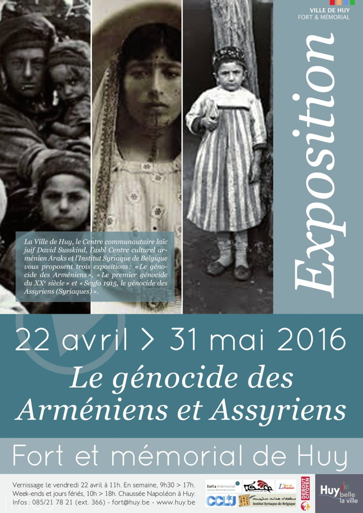 La Ville de Huy, lChristophe Collignon, bourgmestre,; Joseph George, Echevin des musées; Christophe Pire, Echevin des finances; Le Collège Communal, Le Centre Communautaire laïc juif David Susskind; L'ASBL Centre Culturel Arménien Araks et l'Institut Syriaque de Belgique sont heureux de vous convier au vernissage des expositions : « Le génocide des Arméniens », « Le premier génocide du XXe siècle » et « Seyfo 1915, le génocide des Assyriens (Syriaques) ».