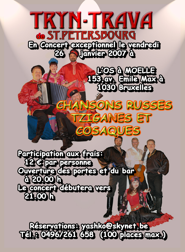 Affiche. Os à Moelle, Schaerbeek. Chansons russes, tziganes et cosaques. Tryn-Trava de St-Petersbourg en concert exceptionnel. 2007-01-26