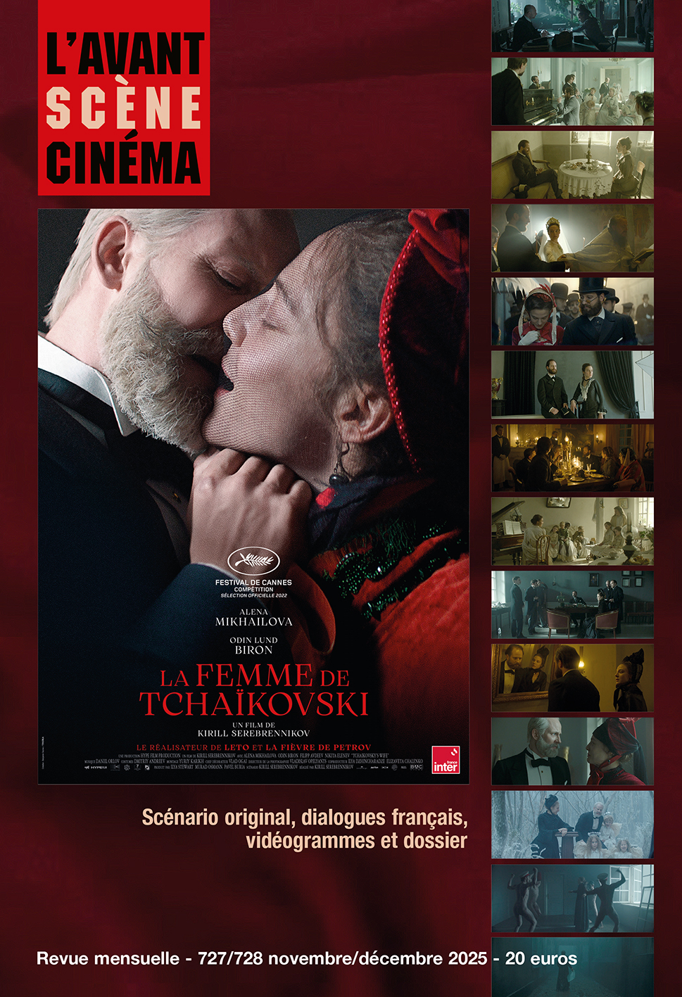 Du samedi 01 novembre 2025 au mercredi 31 décembre 2025 : Sortie du numéro 727/728 (novembre-décembe 2025) de la revue « L'Avant Scène Cinéma » consacrée en partie au cinéma russe : dossier spécial sur le film La Femme de Tchaïkovski (Жена Чайковского) de Kirill SEREBRENNIKOV (Кирилл СЕРЕБРЕННИКОВ)) avec publication du scénario intégral et des dialogues en français (traduction et coordination du dossier par Joël CHAPRON. Egalement panorama du cinéma russe contemporain, publication d'une liste de 25 réalisateurs et interview de Kirill SEREBRENNIKOV et de Sergueï LOZNITSA.