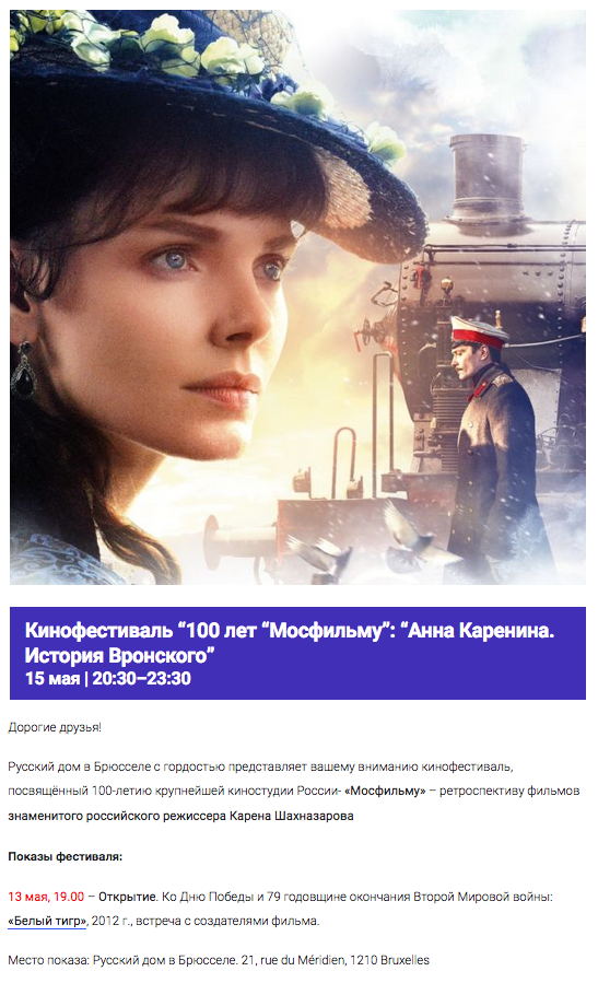 Page Internet. Maison russe Bruxelles. Festival du cinéma. Anna Karénine. Histoire de Vronski. Анна Каренина. История Вронского. 2024-05-15