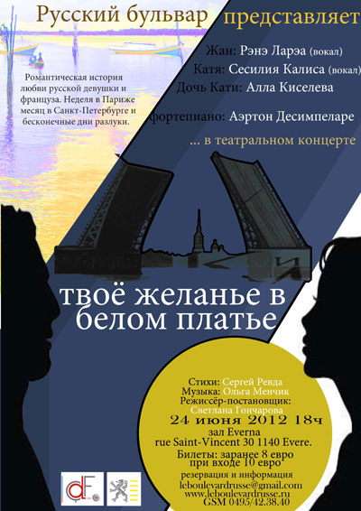 Musique composée par Olga Menchik sur des poèmes de Sergei Revda. Mise en scène de Svetlana Gontcharova. Музыка О. Менчик, стихи С. Ревда, в постановке режиссёра Светланы Гончаровой. Le Boulevard Russe vous convie à son nouveau spectacle musical « Ton désir en robe blanche », une histoire d'amour pleine de tendresse, malgré une séparation obligée. Тема любви во все времена была актуальной, потому что только когда мы любим и любимы, мы по настоящему счастливы. Вместе с героями у зрителя есть возможность окунуться в сферу их чувств и переживаний... Tous les chansons seront interprétées en russe. Joué par : René Laryea : baryton-basse, soliste dans des productions d'opéra à New York, Montréal, Paris et Tokyo. Sesiliya Kalisa : Soprano, diplômée du Conservatoire de Mons, possède une certaine expérience grâce à ces concerts en Belgique et dans la CEI. Ayrton Desimpelaere : piano, diplômé des Conservatoires de Paris, Versailles, Bruxelles, Mons. Possède un orchestre et effectue de nombreux concerts en Europe au piano et à la direction. Diplômé également de la Sorbonne. Actrice : Alia Kisileva.