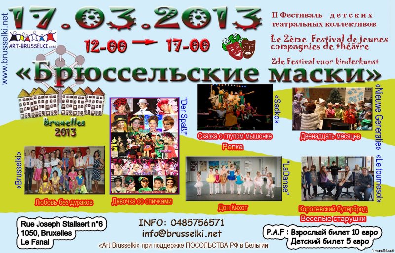 Mars 2013. Evénements à caractère culturel russe annoncésNos meilleurs souhaits de Joyeuses Pâques vous accompagnent à l'occasion de ce billet. Malgré la persistance hivernale, les événements à caractère culturel russe se sont bousculés au cours ce mois de mars dernier, pour se terminer par une conférence sur l'astéroïde de Russie et les comètes de 2013.Bien que plus clairsemés cette fois - le carême s'installe - voici les activités, principalement films et expositions, recensées pour le mois d'avril. En tant que prestation reliée à la résurrection du Christ notons le concert offert le 10 avril par la chorale « Роса и Нота » au malades soignés à l'Institut Pachéco. Nous remercions vivement les personnes nous signalant tant d'événements. Ces derniers sont immédiatement intégrés au calendrier et rendus accessibles via le site vava.be Bien évidemment vos annonces gagnent à disposer d'affiches et/ou d'illustrations attractives. Songez aussi à ceux de votre entourage n'ayant pas d'accès à la toile en leur communiquant la liste des prochains événements. Enfin n'oubliez pas de prendre connaissance des ouvrages reçus à la rédaction.