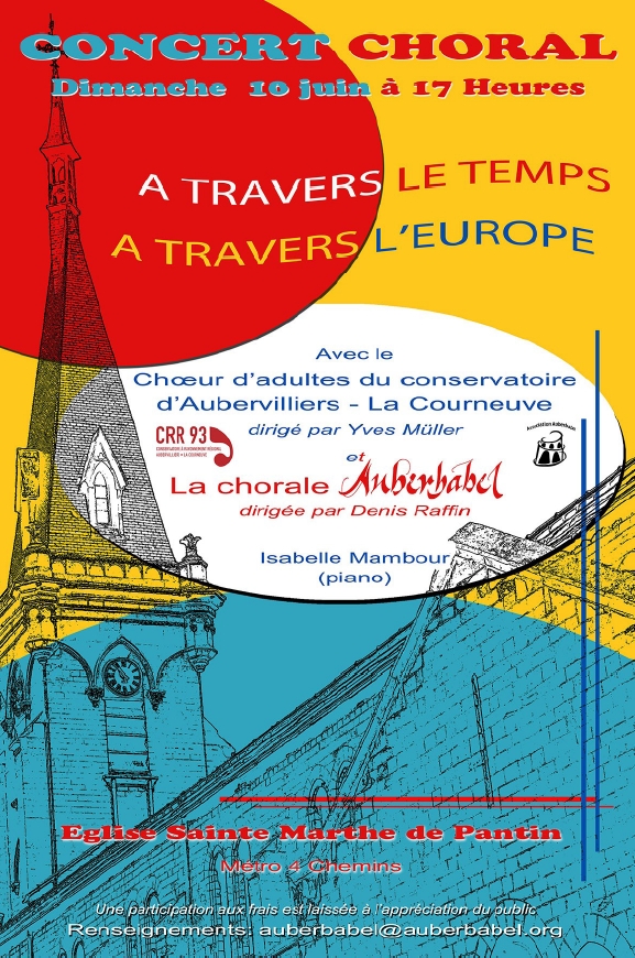 le chœur d'adultes du concervatoire d'Aubervilliers - La Courneuve dirigé par Yves Müller le Choeur d'Adultes du Conservatoire d'Aubervilliers-La Courneuve : Ce choeur d'une vingtaine de choristes amateurs est issu du CRR d'Aubervilliers-La Courneuve. Dirigé par Yves Müller depuis 2005, il explore un répertoire allant de la Renaissance à la musique contemporaine ; la chorale Auberbabel : Issue de l'association Auberbabel, qui milite pour la défense de la diversité linguistique, la chorale Auberbabel s'est fixé pour mission de chanter dans toutes les langues du monde (avec le moins d'accent possible), La chorale compte en son sein des locuteurs russe,... et est dirigée par Denis Raffin depuis 2007; Isabelle Mambourg (piano).