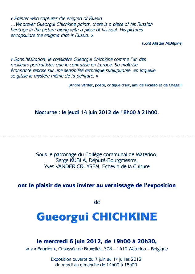 Invitation vernissage exposition Gueorgui Chichkine ce 6 juin 2012 dès 19 heures à la galerie « Ecuries » à Waterloo