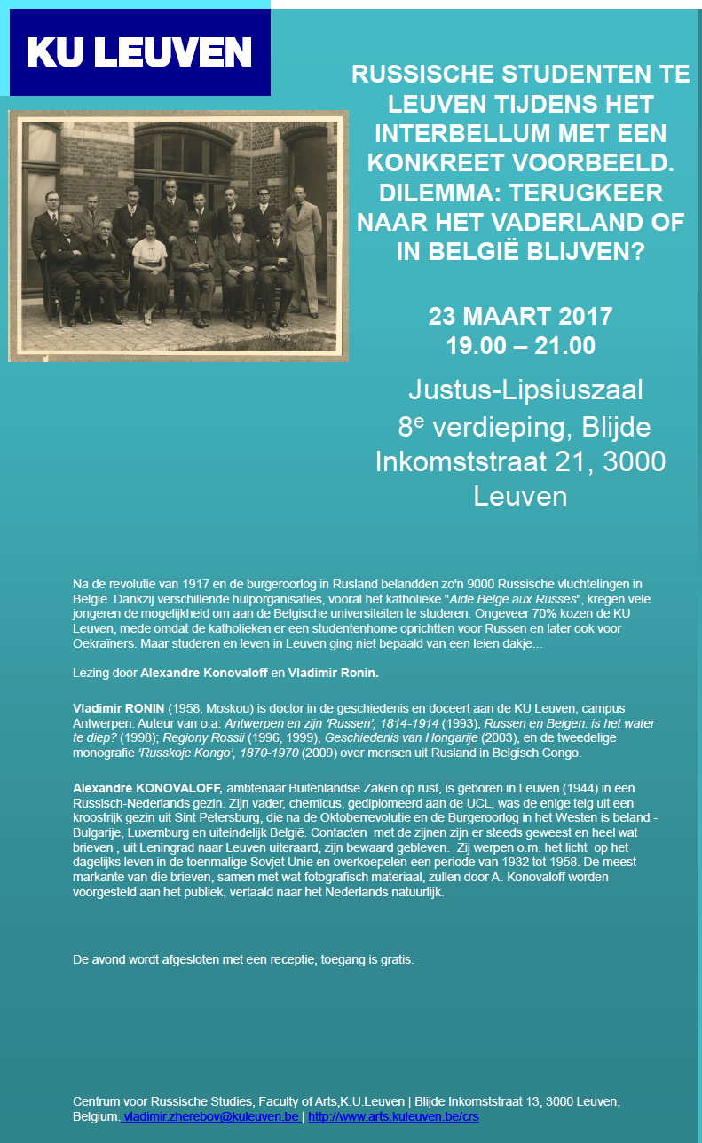 | Calendrier vava.be avril 2017 | Evénements : 21/3-1/4 => Théâtre. La Fin de l’Homme rouge ou le temps du désenchantement (Cuesmes) 1 => Partage. H.E. Mr. Alex Van Meeuwen (Bruxelles) 1 => Revue. Het jaar 1917 in 9 items (Pays-Bas) 31/3-1/4 => Colloque. Le proscrit, le banni, l’émigré (Paris) 1 => Excursion. Châteaux aux alentours de Paris 1 => Soirée Possev. Вечер юмора и смеха (Francfort) 1 => Visite. Антверпенский кафедральный собор для взрослых (Antwerpen) 2 => Visite => Мартышка Марта знакомится с музеем (Bruxelles) 2 => Visite. Musée des instuments de musique (Bruxelles) 3 => Semaine. « Городские истории » во время весенних каникул (Bruxelles) 4-12 => Journées. Vol spatial habité (Saint-Josse-ten-Noode) 5 => Ballet. Le lac des cygnes (Liège) 5 => Visite. « Искусство не спеша » (Bruxelles) 5 => Concert. Посольство мастерства (Saint-Josse-ten-Noode) 6 => Vente. Art Russe (Paris) 6-9 => Ballet. Het Zwanenmeer - 2017 (Liège/Gent/Antwerpen) 8 => Rencontre. Relations belgo-russes pendant la Première Guerre mondiale (Bruxelles) 9 => Ballet Live 2017 : A Hero of our Time (Kinepolis) 9 => Concert. Prokofiev – Rachmaninov. Hommage à la musique russe (Brugge) 9 => Visite. Музей Костюма и Кружев для взрослых (Bruxelles) 11-19 => Voyage. Krasnodar and Volgograd (Russie) 15 => Excursion. Parc des tulipes Keukenhof (Amsterdam) 16 => Visites. Музей поездов и Музей Старых мастеров для всей семьи (Bruxelles) 20 => Vente. Art Russe (Paris) 35 => Présentation. Met de magische transsiberische express op reis door Rusland (Antwerpen) 23 => Visite. Maison d'Erasme (Anderlecht) 25 => Conférence FPPR. Les artistes russes en exil (Bruxelles) 26 => Conférence. Rusland 1917-2017. Van de Russische revolutie tot « Tsaar Putin » (Berchem) 27 => Opéra. La Khovanchtchina de Modeste Moussorgski (Saint-Josse-ten-Noode) 29 => Visite. Musée du chocolat (Bruxelles) Bibliographie : - 1917: quand la révolution a déferlé sur la Russie. - La vie secrète des Romanov. - The socialist network. | |