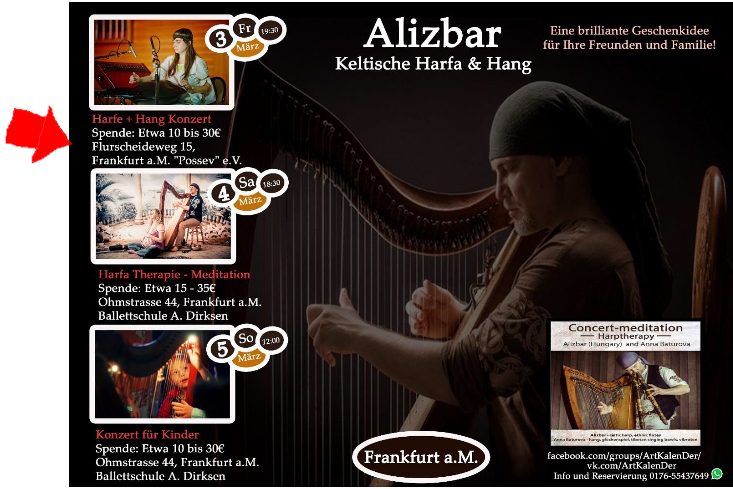 Дорогие Друзья! В начале Марта предлагаем Вам даже два мероприятия. В пятницу 3 Марта необычный музыкальный концерт. Егор Шевченко приглашает насладится уникальным медитативным концертом Элизбара (элизбар это Арфа-музыкант). Играет в дуэте с Анной Батуровой мастерицей Ханга (это инструмент похожий на летающую тарелку).