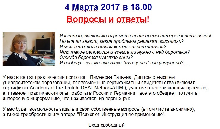 Известно, насколько огромен в наше время интерес к психолоши! Но все ли знают, какие проблемы решают психологи? И чем психологи отпииаюпюя от психиатров? Что такое депрессия и всегда ли нужно с ней бороться? Откуда берётся чувство вины? И вообще - как же всё-таки « там у нас » всё устроено?.... У нас в гостях практический психолог- Пименова Татьяна. Диплом о высшем университетском образовании, всевозможные сертификаты и свидетельства (включая сертификат Асаdemу of the Teutch IDEAL- Method-АТIМ), участие в тепевизионных проектах, а, главное, практический опыт работы в России и Германии - всё это обещает получить интересную информацию, что называется, из первьос рук. У вас будет возможность задать и свои собственные вопросы (в том числе анонимно), а также приобрести книгу автора « Психолог. Инструкция по применению ». Вход свободный.
