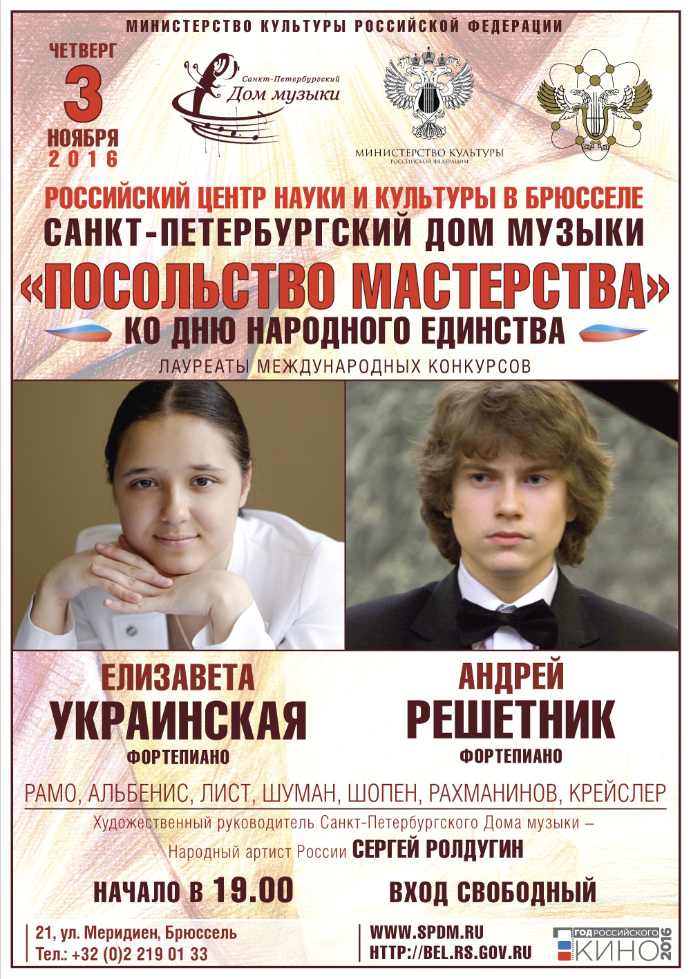 Elizaveta Ukrainskaia (piano) et Andrei Reshetnik (piano) Direction artistique : Serguei Roldougine, directeur de la Maison de la musique de Saint-Pétersbourg. A l'occasion du jour de l'unité nationale. Lauréats de concours internationaux. Рамо, Альбенис, Лист, Шуман, Шопен, Рахманинов, Крейслер. Rameau, Albéniz, Liszt, Schuman, Chopin, Rachmaninov, Kreisler.