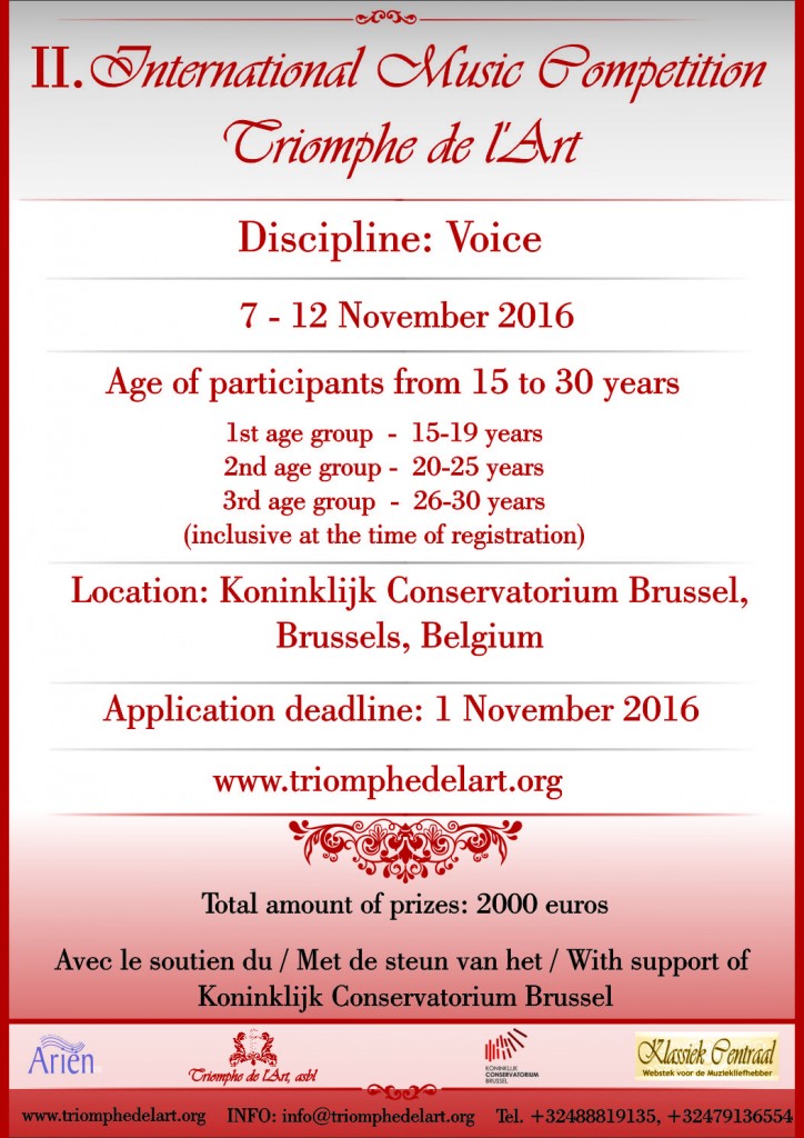 II. International Music Competition « Triomphe de l'Art » in discipline « Voice ». The contest will be held in Brussels (Belgium) from 7 to 12 November 2016 in the Big Hall of the Royal Conservatory of Brussels (KONINKLIJK CONSERVATORIUM BRUSSEL). Total amount of contest prizes is 2000 euro. Jury and the Organizing Committee may establish special prizes for participants, teachers and accompanists : – The Best performance of a work by a Belgian composer – Best accompanist – Young hope Award – Audience Choice Award – Best professor award (for participant’s teacher) – Alumni of KCB Award(s) for one or several participants (graduated students of KCB) – Special KCB Award(s) for one or several participants – Special price(s) from Music Agency Arts & Music Mgt – Special price(s) from Klassiek Centraal music critics (article in the journal on the participant(s) of their choice) – Special prices(s) from « Triomphe de l'Art, asbl »: concert at the annual music festival « Triomphe de l'Art ».