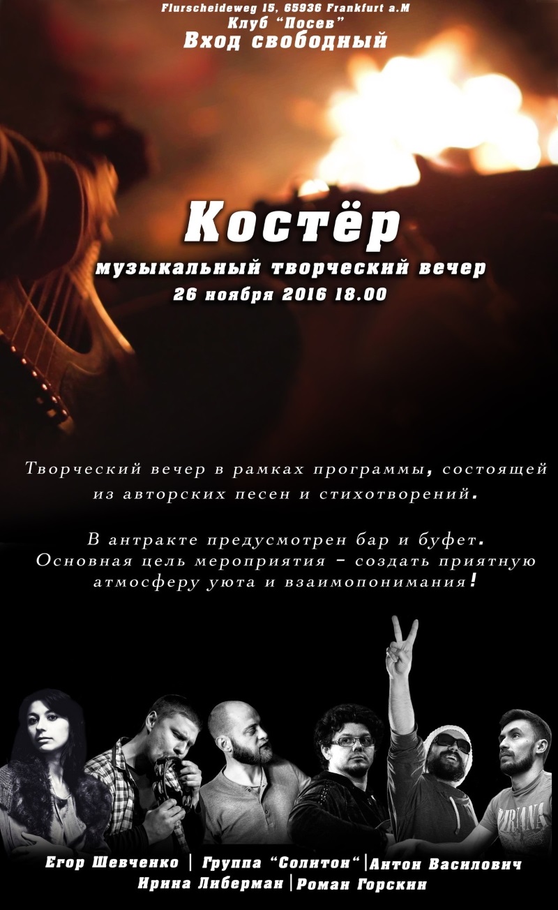 Проводы осени - это праздник на все времена, потому что осень приходит к нам и уходит, уступив место зиме каждый год. Помешать этому не может ни плохое настроение, ни политическая обстановка, ни прогноз погоды... Вас ждёт настоящий праздник души и тела, насыщенная программа, живая музыка, танцы, богатый шведский стол и много интересного! На входе вас встретят с хлебом, салом, орурчиком, рюмочкой. В пользу музыканта и на организацию праздника собираем пожертвование в размере 15 евро. Просьба записываться заранее, чтобы мы никого не обделили и не обидели.