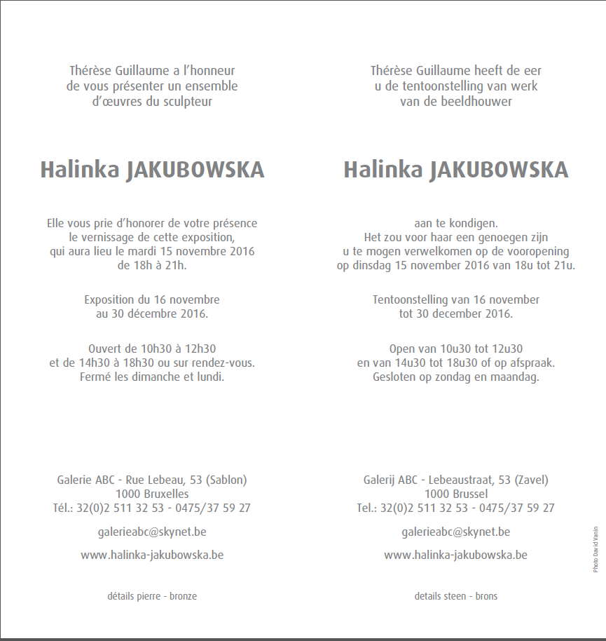 Thérèse Guillaume a l'honneur de vous présenter un ensemble d'œuvres du sculpteur Halinka Jakubowska. Elle vous prie d'honorer de votre présence le vernissage de cette exposition, qui aura lieu le mardi 15 novembre 2016 de 18 à 21 heures. Thérèse Guillaume heeft de eer u de tentoonstelling van werk van de beeldhouwer Halinka Jakubowska aan te kondingen. Het zou voor haar een genoegen zijn u te mogenverwelkomen op de vooropening op dinsdag 15 november 2016 van 18u tot 21u.