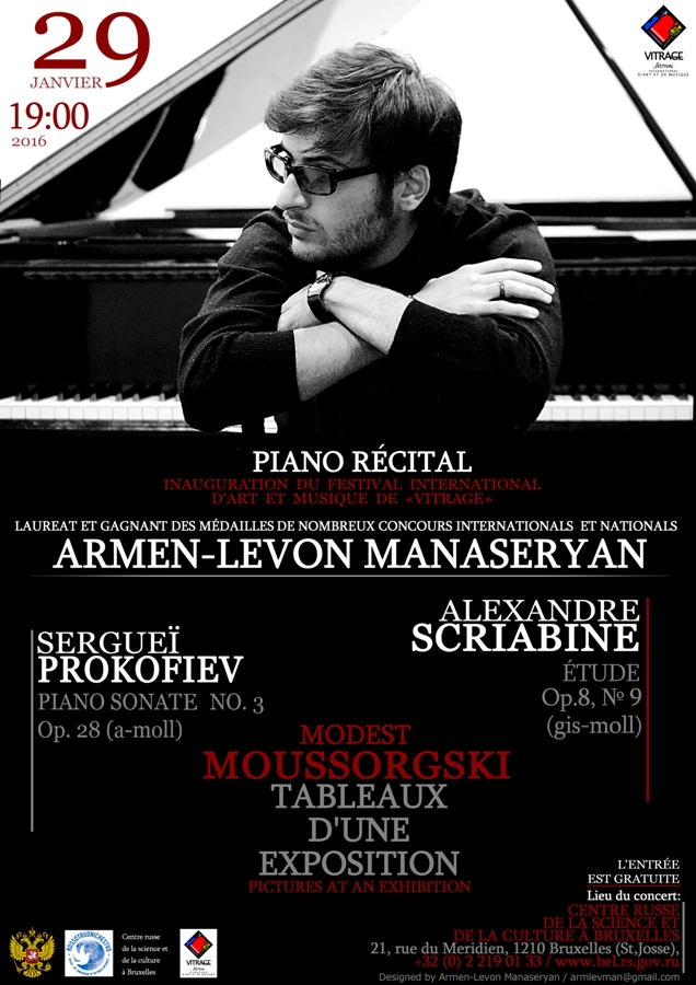 Inauguration du festival international d'art et de musique de « Vitrage ». Piano récital du lauréat des concours internationaux Armen-Levon Manaseryan. Sergueï Prokofiev => piano sonate n°3 Op. 28 (a-momm) Alexandre Scriabine=> Etude Op. 8, n°9 (gis-moll)