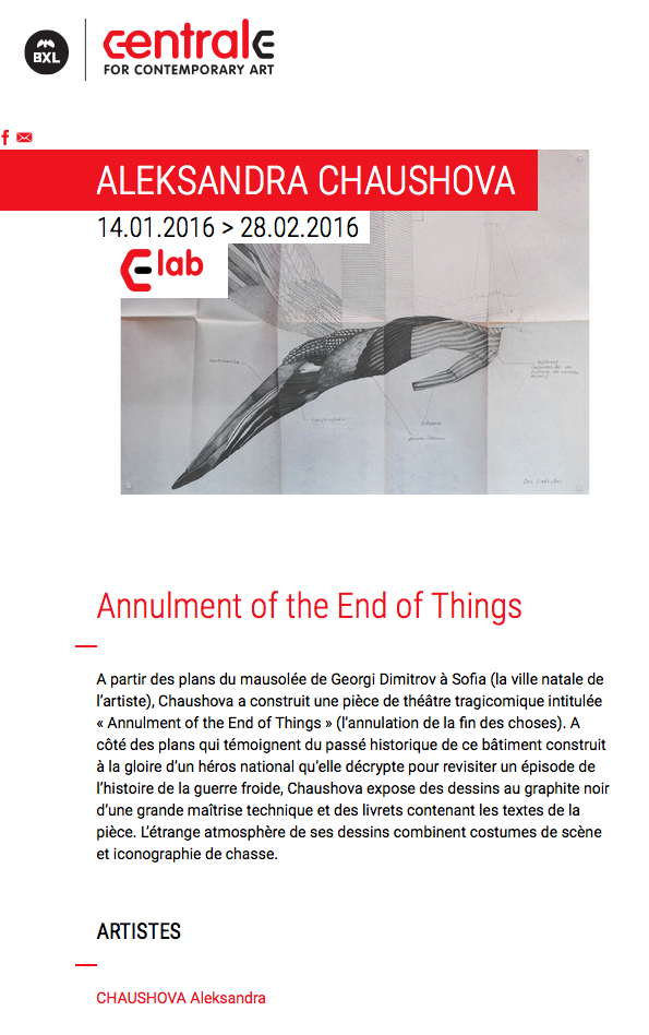 A partir des plans du mausolée de Georgi Dimitrov à Sofia (la ville natale de l’artiste), Chaushova a construit une pièce de théâtre tragicomique intitulée « Annulment of the End of Things » (l’annulation de la fin des choses). A côté des plans qui témoignent du passé historique de ce bâtiment construit à la gloire d’un héros national qu’elle décrypte pour revisiter un épisode de l’histoire de la guerre froide, Chaushova expose des dessins au graphite noir d’une grande maîtrise technique et des livrets contenant les textes de la pièce. L’étrange atmosphère de ses dessins combinent costumes de scène et iconographie de chasse. Aleksandra Chaushova, née le 07.06.1985 à Sofia, vit et travaille à Bruxelles. Sa pratique artistique inclut le dessin, l’illustration, l’écriture et la peinture. Ses travaux ont été exposés au WIELS Centre d’Art Contemporain, Brussels Art Factory, les galeries Albus Lux (NL) et Dorothea Schlueter (DE). En 2010 elle a participé au programme de résidences d’artistes de WIELS à Bruxelles. En automne 2012 elle était invitée comme étudiante visitante en option peinture (classe de Lucy McKenzie) à la Kunstakademie Dusseldorf. Elle fait un doctorat en Art et Sciences de l’art à l’Université Libre de Bruxelles en collaboration avec l'ENSAV La Cambre. Après le changement du pouvoir en 1989, les artistes d’Europe de l’Est se retrouvent dans un passage d’une culture visuelle dominante vers une autre. L’équilibre entre l’acceptation de l’héritage visuel totalitaire et le désir de contemporanéité semble précaire. Certains sont tentés par une possible « auto-colonisation » : faire ce qui est attendu de faire. D’autres s’engagent dans une réflexion profonde sur le passé sans peur des contradictions et des ambivalences. C’est notamment le cas de Zofia Kulik, Gerhardt Richter, Komar et Mélamid. Inspirée par leur travail et dans la recherche de mon propre positionnement, je m’intéresse à la manipulation des documents historiques et les représentations dans la presse des années 50-80. La juxtaposition des faits, d’images documentaires et fictives, cause une contamination de la réalité avec de la fiction. Alors on pourrait analyser le narratif de la réalité en termes littéraires. Par exemple du point de vue du narrateur douteux ou de la suspension consentie de l’incrédulité. http://ed20.hotglue.me/Aleksandra%20Chaushova/http://www.wiels.org/fr/residencieslist/37/Alexandra-Chaushova