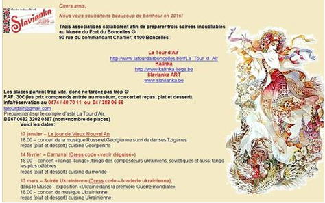 • Renseignements par téléphone : 0496 66 29 89 après 18 heures ou courriel : slavianka.art at hotmail dot com