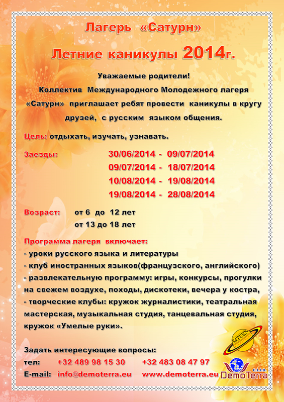 30/06/2014 - 09/07/2014 09/07/2014 - 18/07/2014 10/08/2014 - 19/08/2014 19/08/2014 - 28/08/2014 Возраст : от 6 до 12 лет и от 13 до 18 лет. Программа лагеря включает : уроки русского языка и литературы ; клуб иностранных языков(французского, английского) ; развлекательную программу: игры, конкурсы, прогулки на свежем воздухе, походы, дискотеки, вечера у костра ; творческие клубы : кружок журналистики, театральная мастерская, музыкальная студия, танцевальная студия, кружок « Умелые руки ».
