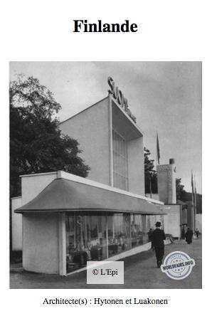 Exposition Universelle de Bruxelles 1935 Thème des transports et de la colonisation. Finlande Architecte(s) : Hytonën et Luakonen Le Comité organisateur de la section finlandaise comprenait : M. Jaako Kahma, directeur général de l'Association d'exportation, et grand ami de la Belgique, le baron E.-F. Wrede, le Ministre U.-U.-G. Orasma, M. Robert Lavonius, M. Arthur Wetzell, M. Urho Kevimaki. M. l'architecte Harry Rôneholm, remplissait les fonctions de commissaire général, M. Sigurd Majorin, vice-consul de Finlande à Anvers, étant commissaire général adjoint. Les plans du pavillon étaient l'œuvre de MM. Hytonën et Luakonen. Le bâtiment couvrait 200 mètres carrés et se présentait sous la forme d'un grand bloc blanc, détaché sur un fond de verdure, aux abords du Pavillon de la Ville de Rome. Un mât, semblable à celui que les Scandinaves plantent au seuil de leur habitation, élevait très haut l'étendard finlandais, croix bleue sur fond blanc. Et la façade n'était qu'une immense verrière — si bien que du dehors, les passants apercevaient tout l'intérieur du pavillon. La partie principale en était constituée par une vaste salle en fer à cheval, décorée des écussons des neuf provinces finlandaises. Le parquet était en fin contreplaqué ; aux murs, les architectes avaient dessiné neuf fresques synthétiques, résumant les aspects pittoresques et architecturaux des régions de la Finlande. C'était surtout la Finlande touristique et culturelle qu'on avait tenu à montrer : et quelques images symboliques évoquaient la vie en ces régions si peu connues encore : un voilier, un canot, un archipel, un arbre, un athlète en course, un lynx, un ours, un pêcheur jetant ses filets, un cerf, une paysanne inclinée vers la terre qu'elle cultive — autant de visions précises et schématiques de l'existence finlandaise et de ses particularités. D'habiles photomontages, où le désordre était un effet de l'art et du goût le plus adroit, montraient la vie joyeuse des plages du pays, la splendeur des chutes d'eau, la foulée du coureur Nurmi, gloire de sa patrie, les ports de chargement des bois (celui de Ukras est le plus important du monde), les cathédrales, les cloîtres et les grandes Ecoles ; les ateliers, les scieries, les entrepôts ; les paysages enneigés de la Laponie aux confins septentrionaux de la Finlande. Des vitrines, ouvertes sur l'avenue rassemblaient des faïences, des étoffes, des cristaux, des bronzes, mille objets d'art appliqué, décelant une culture très ancienne et des goûts raffinés.