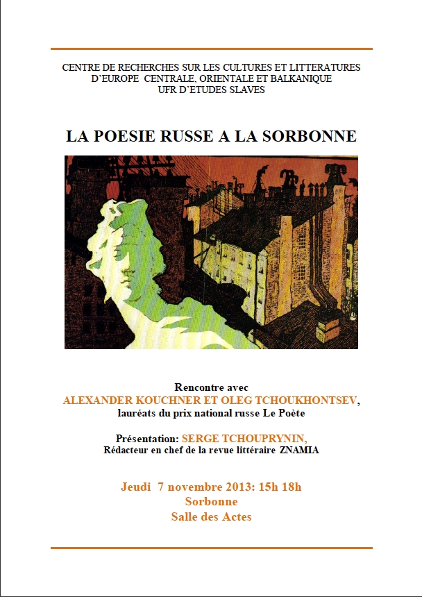 lauréats du prix national russe Le Poète Après-midi poétique à la Sorbonne suivie par un colloque à la Maison de la recherche. Présentation : Serge Tchouprynin, Rédacteur en chef de la revue littéraire Znamia. Centre de Recherches sur les cultures et littératures d’Europe centrale, orientale et balkanique UFR d’Etudes slaves.