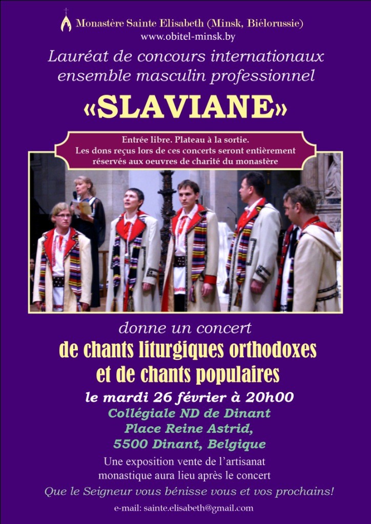 Le chœur professionnel « Les Slaves » (composé de sept chanteurs qui chantent dans la chorale de la liturgie du monastère Sainte Elisabeth Féodorovna de Minsk) se produira à Ittre. Le but de ce concert de charité - la collecte de dons pour soutenir les activités sociales du monastère de Sainte-Elisabeth. Nous vous invitons cordialement, votre famille et vos amis à assister à ce concert le programme qui sera présenté : chants liturgiques et chansons folkloriques slaves. Nous apprécierions votre aide pour diffuser cette information auprès de vos amis et connaissances. Après les concerts, vous pouvez acheter des DVD, des icônes, des cadeaux, du miel, des herbes, des bougies et autres articles.