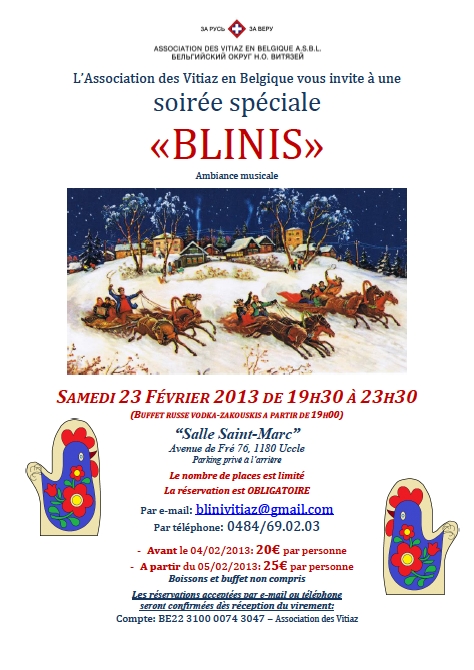 Concert de l'ensemble de musique folk | Концерт фольклорного ансамбля « Золотой Плёс » Souper traditionnel Russe | Ужин в традициях русской кухни Loterie | Благотворительная лотерея Vente de produits équitables du terroir Russe | Ярмарка-продажа русских продуктовVente de livres | Книжный киоск Cette soirée caritative est organisée au profit de l’Ecole et de la Communauté de l’Eglise Orthodoxe de la Sainte Trinité à Bruxelles. Pour plus d’informations vous pouvez nous contacter soit : par téléphone au 0473 549 767 ou au 0488 860 207 ; ou par courriel : svp333 at gmail dot com Nous vous accueillerons avec grand plaisir… С наилучшими пожеланиями du comité organisateur : Светлана (Svetlana POPOVA)