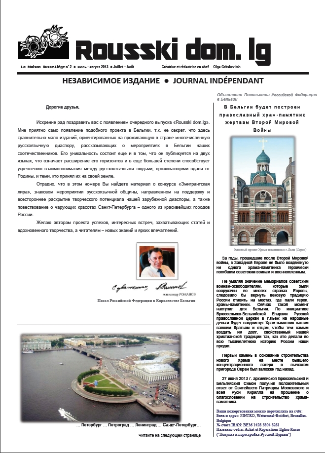 Olga Gritskevitch Независимое издание — Journal indépendant В Бельгии будет построен православный храм памятник жертвам Второй Мировой Войны Культурные параллели — Cultures parallèles Pétersbourg, Pétrograd, Léningrad, Saint-Péterbourg, par Pavel Goldshtein Les marionnettes liégeoises par Denis Fauconnier Пятый Всемитрный поэтический фестиваль « Эмигрантская лира-2013 ». Александр Мельник Это интересно — C'est intéressant Как провести каникулы в Льеже... и не только Моя история, Наталья Жоаким