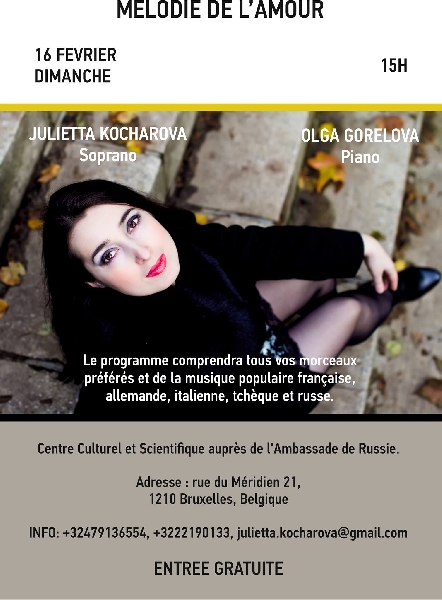 Maria Nikiskaya (piano) et Sesiliya Kalisa (mezzo-soprane) Schaerbeek - Le duo « Mélodie », ainsi que l'atelier de musique de l'école « Mélodie », initiés tous deux par la pianiste Maria Nikiskaya et la mezzo-soprane Sesiliya Kalisa, sont nés d'un amour réciproque pour la musique, les arts et la nostalgie de la culture russe. La première du duo a lieu en juillet 2013 lors du Festival Mondial de la Poésie à Bruxelles et Paris. Ce premier succès inspire les deux artistes qui créent ensemble un répertoire intéressant et lumineux pour voix et piano ainsi qu'un programme de concerts variés. « Clair de lune » présentera des œuvres de musique française, brésilienne et russe. Nous pourrons y écouter : C. Saint-Saëns, G. Bizet, C. Debussy, W. Henrique, S. Rachmaninov, P. Tchaïkovski, P. Boulahov, etc. Il s'agit d'un programme qui offre au spectateur une visite à travers la musique et les espaces lointains en nous faisant découvrir les richesses culturelles de différents pays.