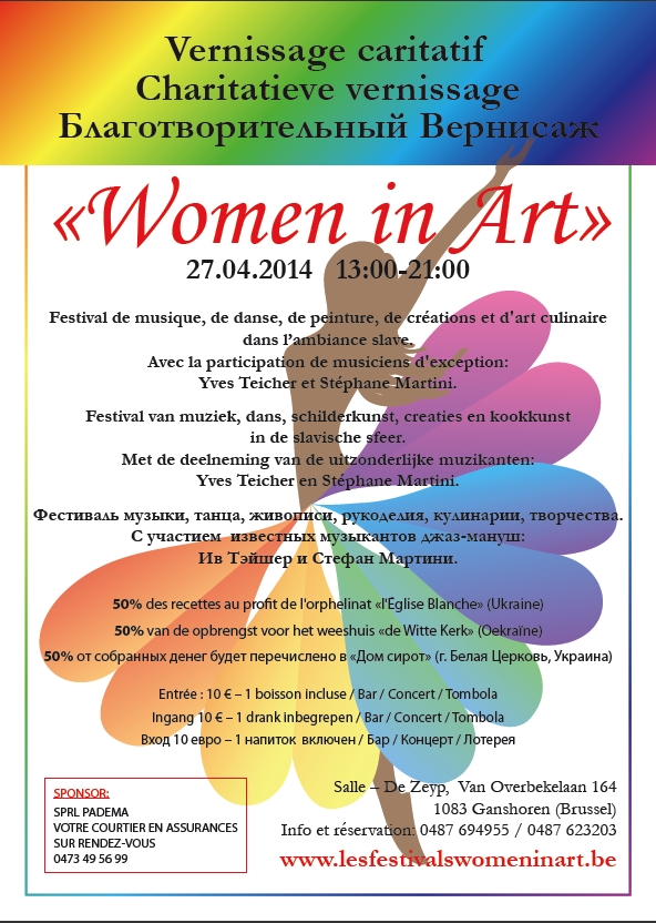 Festival de musique, de danse, de peinture, de créations et d'art culinaire dans l’ambiance slave. Avec la participation de musiciens d'exception: Yves Teicher et Stéphane Martini. Фестиваль музыки, танца, живописи, рукоделия, кулинарии, творчества. С участием известных музыкантов джаз-мануш: Ив Тэйшер и Стефан Мартини. Festival van muziek, dans, schilderkunst, creaties en kookkunst in de slavische sfeer. Met de deelneming van de uitzonderlijke muzikanten : Yves Teicher en Stéphane Martini Приглашение : Дорогие друзья ! 27 апреля состоится 2й благотворительный вернисаж Клуба Womeninart! Приглашаем вас поддержать нашу инициативу, и разделить с нами это мгновенье вдохновения и радости! Ждём вас и ваших друзей! Шиман Светлана Клуб WomeninART