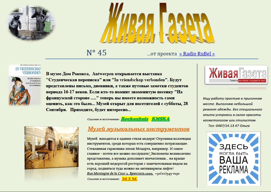 Margarita Chernikova Музей музыкальных инструментов Автобусная экскурсия с Владимиром Рониным Торты и пирожные на заказ Ретроспектива фильмов Сокурова в Брюсселе Интересные факты о Бельгии L'air du temps Юмор от доктора Керчь О, Времена... О, Нравы,,,