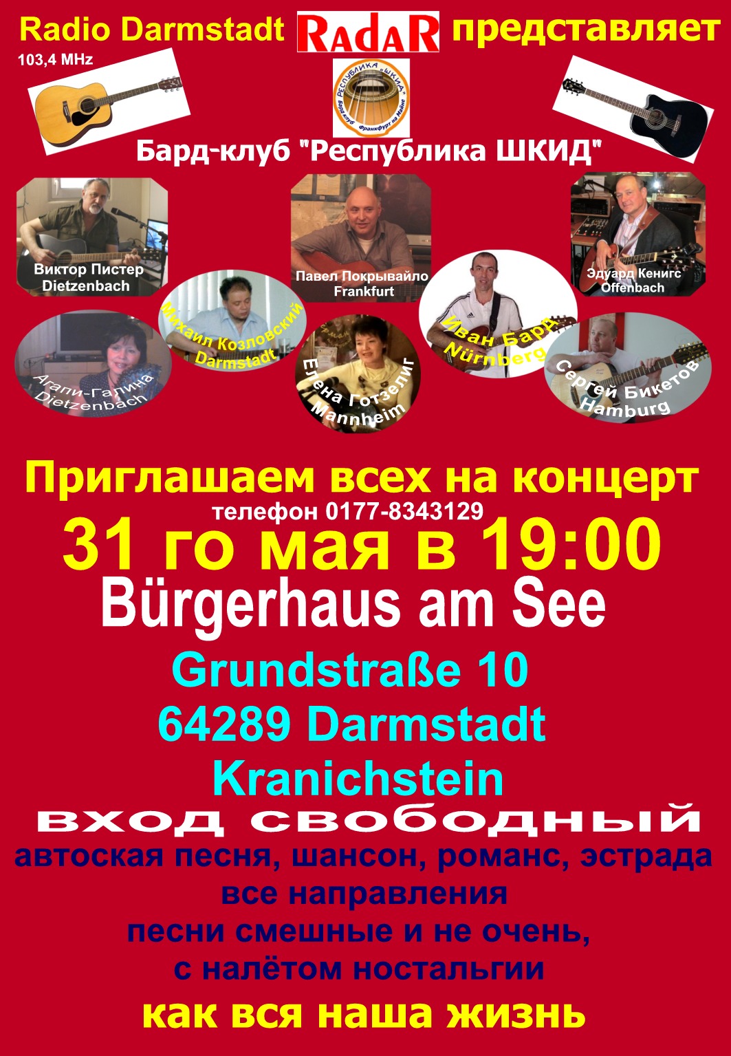 Radio Darmstadt RadaR (103,4 MHz) Приглашаем всех на концерт. Авторская песня, шансон, романс, эстрада. Все направления песни смешные и не очень, с налётом носталгии как вся наша жизнь.