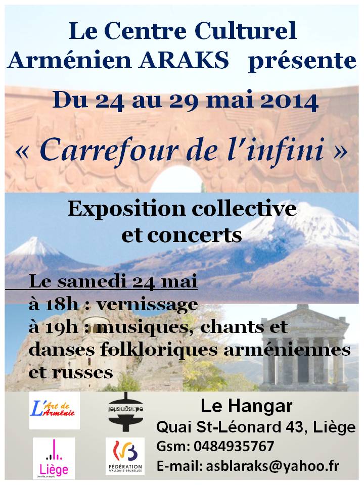 PAF : 5€ Centre Culturel Arménien ARAKS, ASBL « Araks » - Liège Hermine AZARYAN, Présidente de l'asbl ARAKS - « Ambassadeur du Pays de Liège », rue Jonruelle 11 – 13, 4000 Liège / GSM : 0484 93 57 67 / Courriel : asblaraks at yahoo.fr