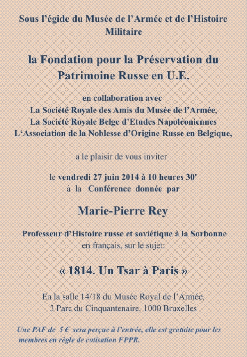 Под эгидой Музея Армии и Военной Истории, Фонд Сохранения Русского Наследия в Бельгии, совместно с : Королевским Обществом Друзей Музея Армии ; Королевским Бельгийским Обществом Изучения Времён Наполеона ; Ассоциации Русского Дворянства Русского в Бельгии. Имеет честь пригласить вас в пятницу 27 июня 2014 года в 10:30 на Лекцию Профессора русской и советской истории в Сорбонне Marie-Pierre Rey, Автор представит на французском языке оригинальную диссертацию на тему : « 1814 : Un Tsar à Paris / 1814 : Царь в Париже »