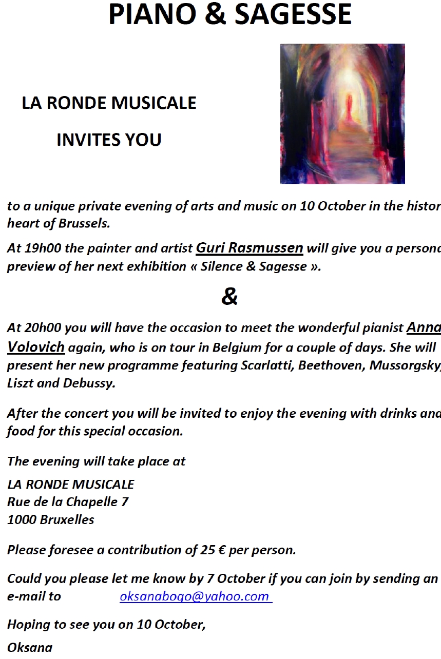 Tatiana et Oksana sont administrateurs. Groupe Privé · 237 membres « La Ronde Musicale » a le plaisir d'offrir un moment suspendu à un public très particulier, typique de la Capitale de l'Europe, brassant des diplomates et eurocrates, des bruxellois de souche et des expats, des étudiants et des artistes venus d'horizons différents. Lors de ces rencontres exclusives, les musiciens de renommée internationale enchantent ceux qui aiment profondément l’art de la musique.