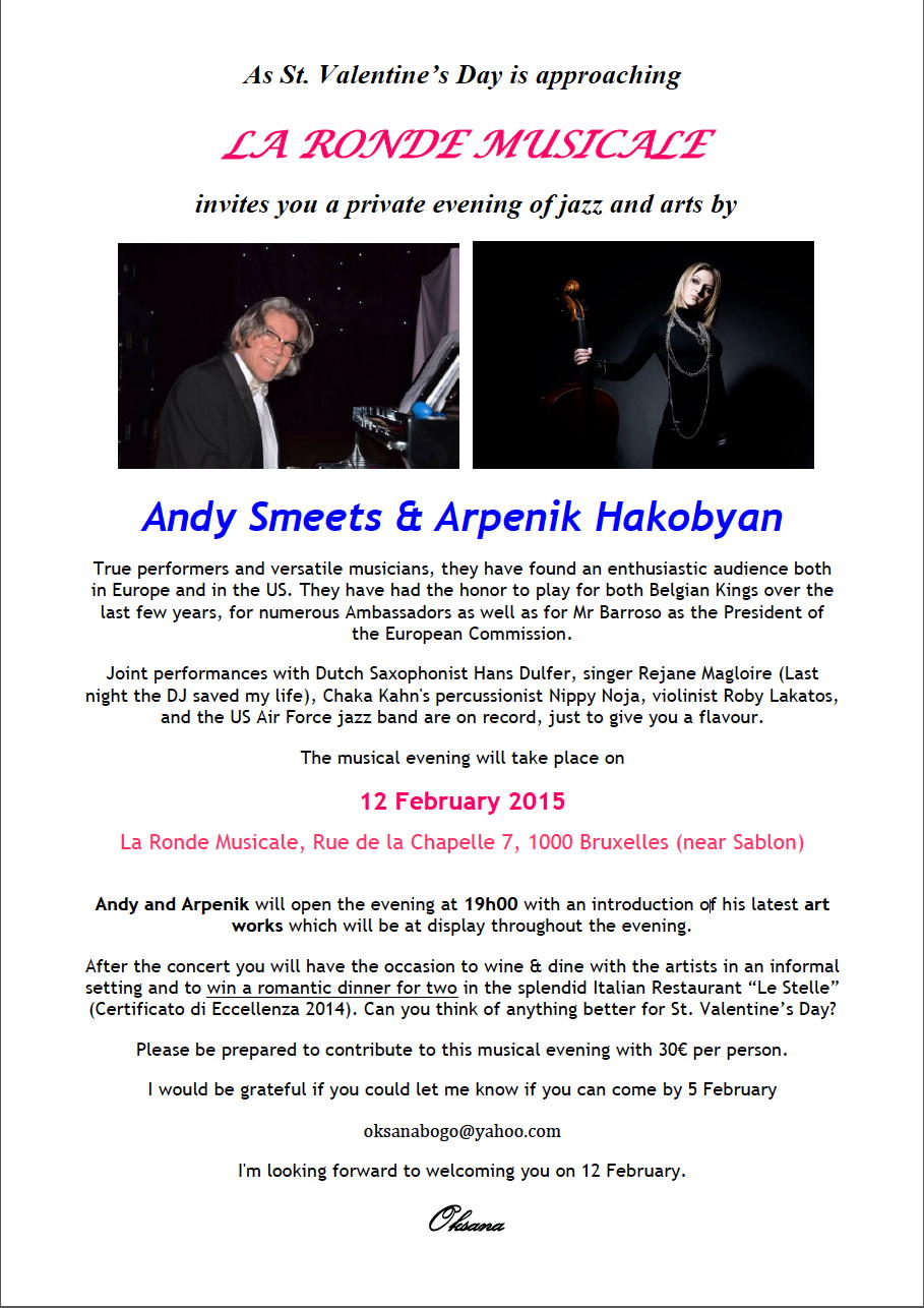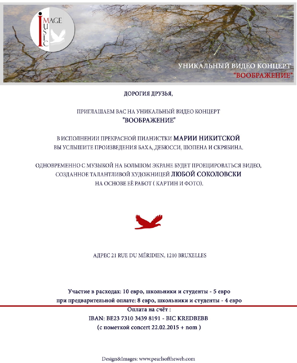 Посвящённый открытию русскоязычного клуба « Музыкант » в Брюсселе. Dédié à l'ouverture du club russophone « Muzikant » de Bruxelles. Dear friends, I send you all my best wishes for a Happy New Year 2015 and want to use this occasion to attach this invitation for our next concert. I am very glad to open this New Year with opening concert of a New russian club « Muzikant ». In the program russian rock pop songs, jazz improvisations, classical themes in jazz arrangements, chanson française. This event takes place on February 1, 16 o'clock at the Russian Cultural Center, rue du Meridien 21, Brussels. Hope to see you all,  Luba Barsky.