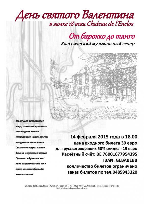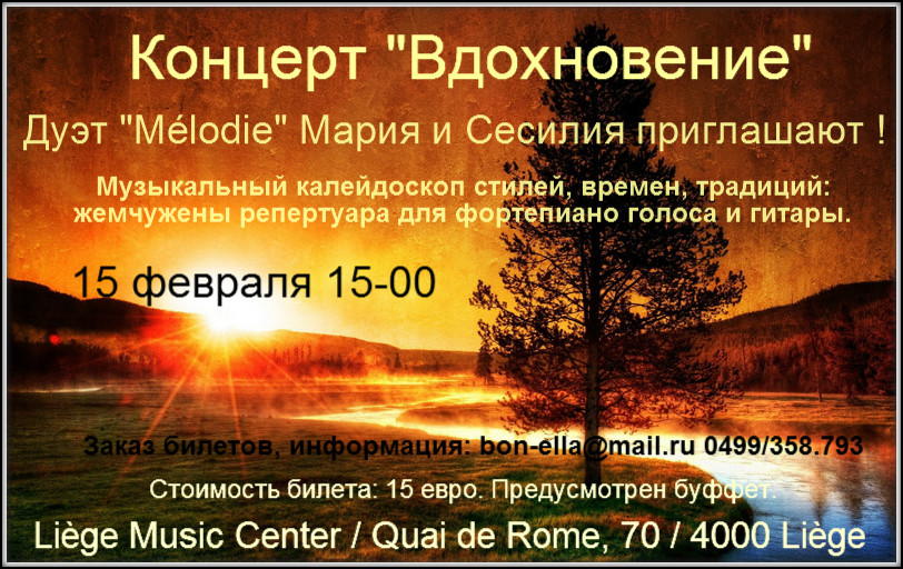 Стоимость билета: 7 евро, 4 евро (студенты) и детям до 8 лет бесплатно. После концерта Вас ждет небольшой банкет. Les prix des billets: 7 euros - 4 euros (étudiants). Les enfants de moins de 8 ans - gratuit. Petit banquet aura lieu après le concert. Toutes les boissons et la nourriture sont gratuites! По вопросам резервации билетов обращаться : / Pour toutes les questions sur la réservation de billets : mobile : 0488 81 91 35 / courriels : triomphe.de.lart at gmail dot com или info at triomphedelart dot org