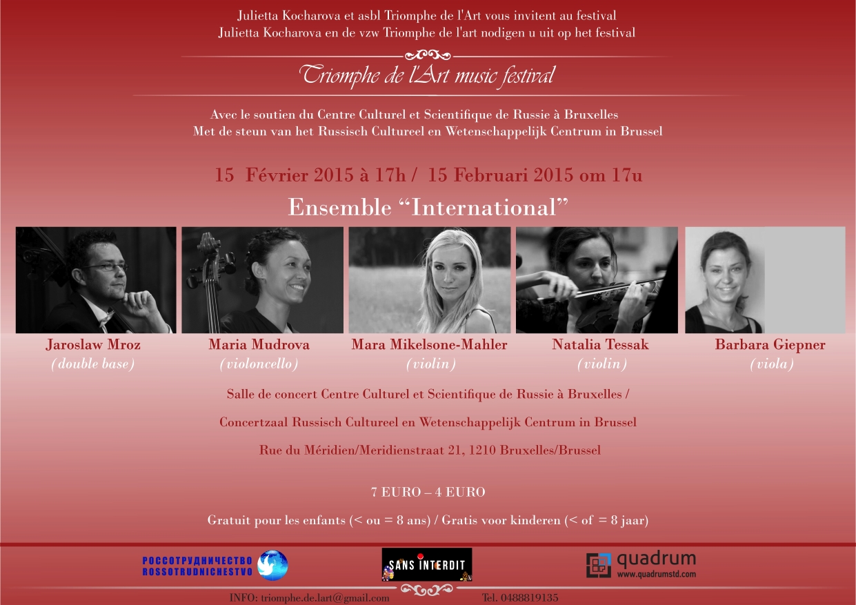 Ne manquez pas la performance unique de l'ensemble de musique « International ». Julietta Kocharova et « Triomphe de l'Art, asbl » sont heureux de vous inviter à un concert d'un ensemble de musique « International », qui a été formé des musiciens jeunes et actifs de tout le monde entier. Le nom du groupe montre la composition internationale de musiciens de la Belgique, la Russie, la Lettonie, l'Italie, l'Allemagne et l'Australie. Lors du concert vous aurez l’occasion d’entendre le très belle musique slave : - Anton Arensky — Quartet en a-moll, opus 35 pour violon, alto, violoncelle et contrebasse ; - Antonin Dvorak — Quintette en G-DUR, opus 77 pour deux violons, alto, violoncelle et contrebasse.