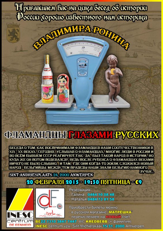 Стоимость экскурсии - 25 евро.В стоимость включены билеты в оба музея. Мест в группах ограничено (по 20 человек), поэтому просим всех желающих обязательно резервировать и сообщать нам в какой именно день вам удобнее пойти, а также выкупать заранее билеты. Купить билеты можно в русском магазине « Матрешка », или перечислить деньги на НОВЫЙ банковский счет : IBAN : BE 22 7310 3847 7447 | BIC: KREDBEBB INESC CENTRUM VZW, Sint-Michielskaai 15/31, 2000 Antwerpen Более подробная информация по тел : 0484/ 738 158 (Наталья) и 0484/ 100 848 (Галина)