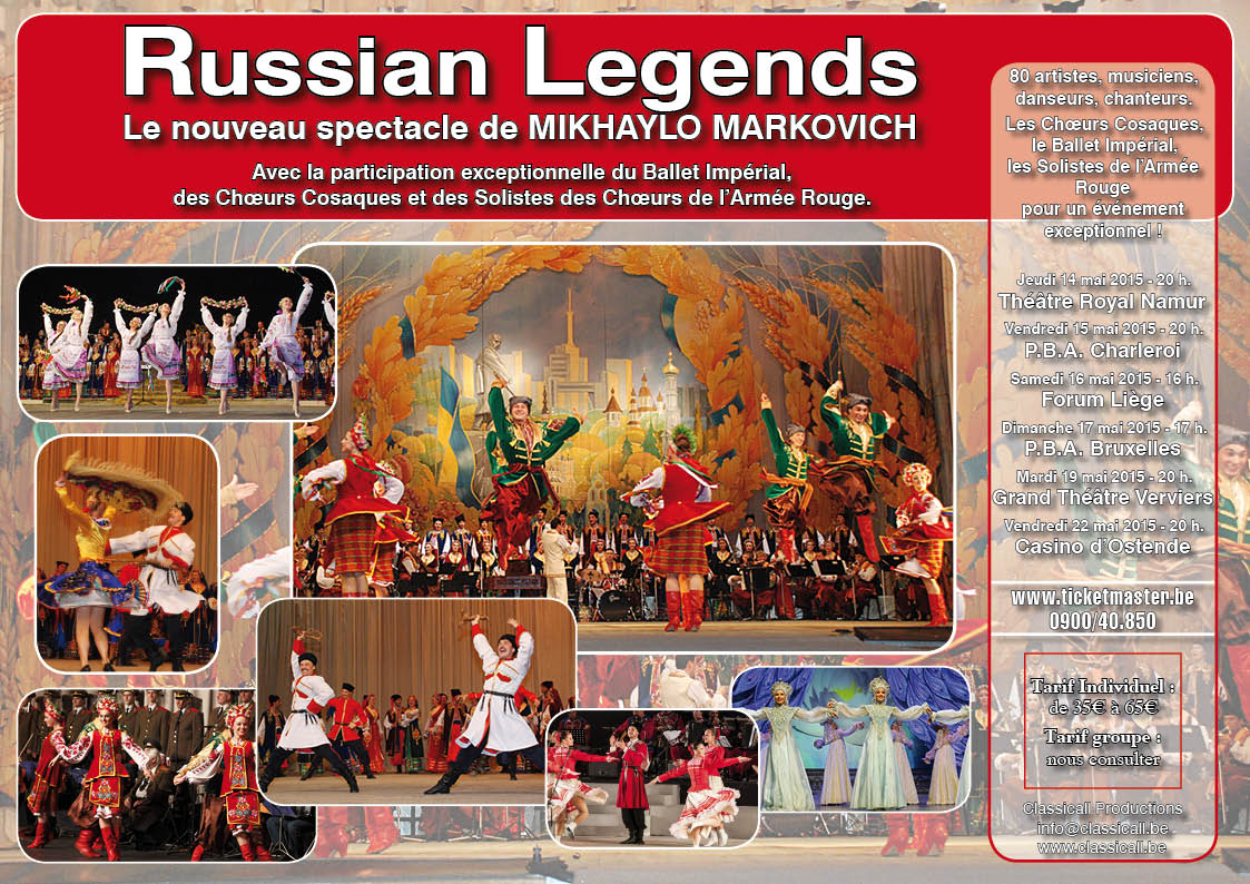 Voici le lien vers la liste des événements - une trentaine déjà - repris pour ce mois de mai 2015. Nous y relevons par exemple : La tournée « Russian legends » du nouveau spectacle de Mikhaylo Markovitch qui s'étale du 14 au 23 mai ;La reprise du festival international « Rendez-vous avec la Russie » au Parc Elisabeth et ce avec la présence cette année du groupe de musique russe et tsigane « Karandash » ;Les prochains concerts « Acoustic de-Tension » d'hôtes milanais organisés à l'hotel Aloft et à la « Ronde Musicale » ;La soirée théâtre proposée par Nathalie Reingardt au Centre Culturel de Russie à Bruxelles. Y seront joués en langue russe des extraits de pièces de Gogol, Pouchkine, Tolstoï et Zagoskine ;Enfin, Lire la suite... car suivent aussi assemblées, concerts, expositions, excursions, folklore et vente d'art. Note : sous la rubrique bibliographie et en lecture => la traduction en russe de l'ouvrage de Marie-Pierre Rey intitulé « L'effroyable tragédie : Une nouvelle histoire de la campagne de Russie » vient de paraître en lanque russe à Moscou sous le titre « Страшная трагедия. Новый взгляд на 1812 год » aux éditions Российская политическая энциклопедия.