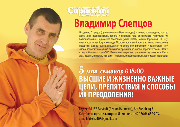 Владимир Слепцов. Дорогие друзья! Нам хочется поделиться с Вами радостной новостью. В Германию приезжает удивительная личность: мастер хатха- и бхакти-йоги, ведущий монашеский образ жизни, преподаватель теории и практики йоги Бомбейского Института им. Бхактиведанты «Ведическое здоровье» (Vedic Health), ученик Александра Геннадиевича Хакимова, получивший посвящение в ведическую традицию, ученик Торсунова О. Г. , изучающий и практикующий аюрведу. Профессиональный консультант по личностному развитию, бизнес-тренер, специалист по восточной философии и психологии. Владимир Слепцов, многим известный под духовным именем – Вальмики прабху, милостиво принял приглашение посетить наш регион и дать лекцию на тему « Высшие и жизненно важные Цели, препятствия и способы их преодоления! ». Лекция пройдет 5.05 в 18:00 в многим из Вас уже знакомом и полюбившемся местечке – Зарштедт (регион Ганновера). Мы приглашаем всех желающих посетить лекцию, на столь актуальную сегодня тему, наполниться мудростью, задать наболевшие вопросы, поделиться собственным опытом, познакомиться с новыми интересными людьми и получить заряд счастья и оптимизма. Мы с удовольствием ответим на интиресующие Вас вопросы и будем рады служить Вам. С пожеланием Вам счастья и Божественной любви Ваши организаторы семинара, Ирина и Евгений.