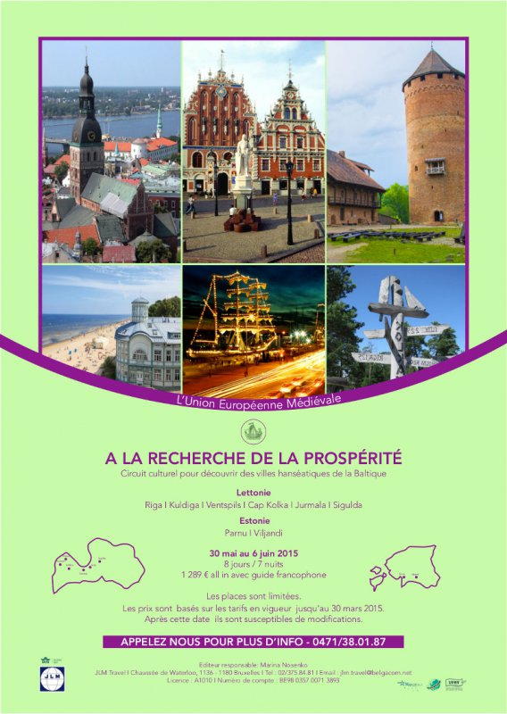 Circuit culturel pour découvrir des villes hanséatiques de la Baltique. Турагентство Lever Triomphal совместно с турагентством JLM TRAVEL организовывает поездку в Латвию и Эстонию с 30 мая по 6 июня 2015 г. Маршрут : Рига → Кулдига → Вентспильс → Колка → Юрмала → Сигульда → Пярну → Вильянди. Стоимость: 1289 € на одного, проживание в стантартном двухместном номере. Доплата за заказ одноместного номера — 290 €. Есть возможность заказать номер люкс за доп. плату.
